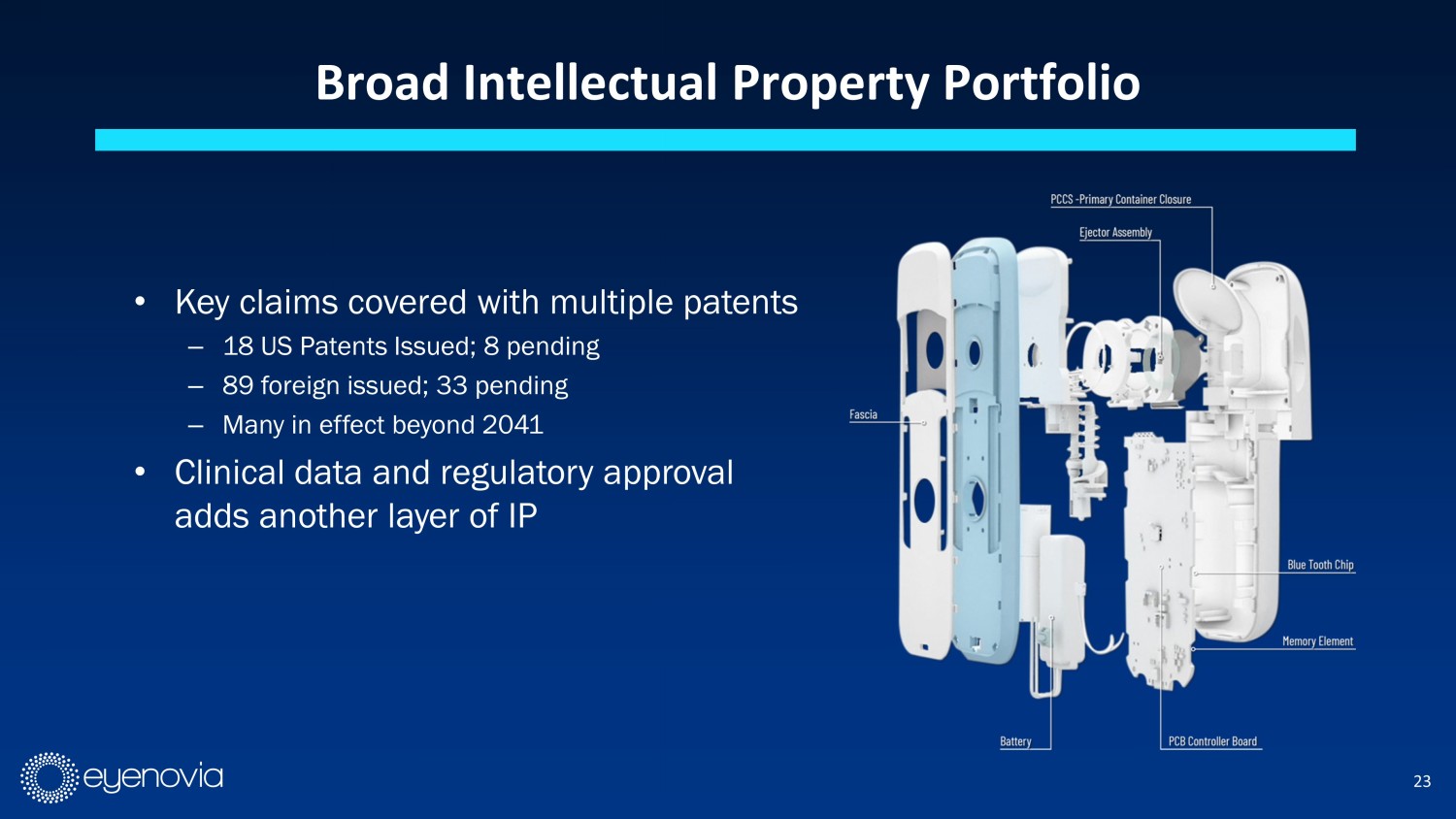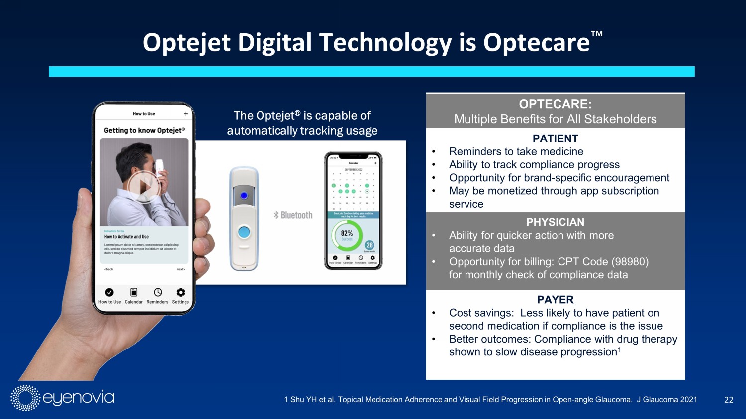 22 Optejet Digital Technology is Optecare Ρ The Optejet ® is capable of automatically tracking usage OPTECARE: Multiple Benefits for All Stakeholders PATIENT • Reminders to take medicine • Ability to track compliance progress • Opportunity for brand - specific encouragement • May be monetized through app subscription service PHYSICIAN • Ability for quicker action with more accurate data • Opportunity for billing: CPT Code (98980) for monthly check of compliance data PAYER • Cost savings: Less likely to have patient on second medication if compliance is the issue • Better outcomes: Compliance with drug therapy shown to slow disease progression 1 1 Shu YH et al. Topical Medication Adherence and Visual Field Progression in Open - angle Glaucoma. J Glaucoma 2021