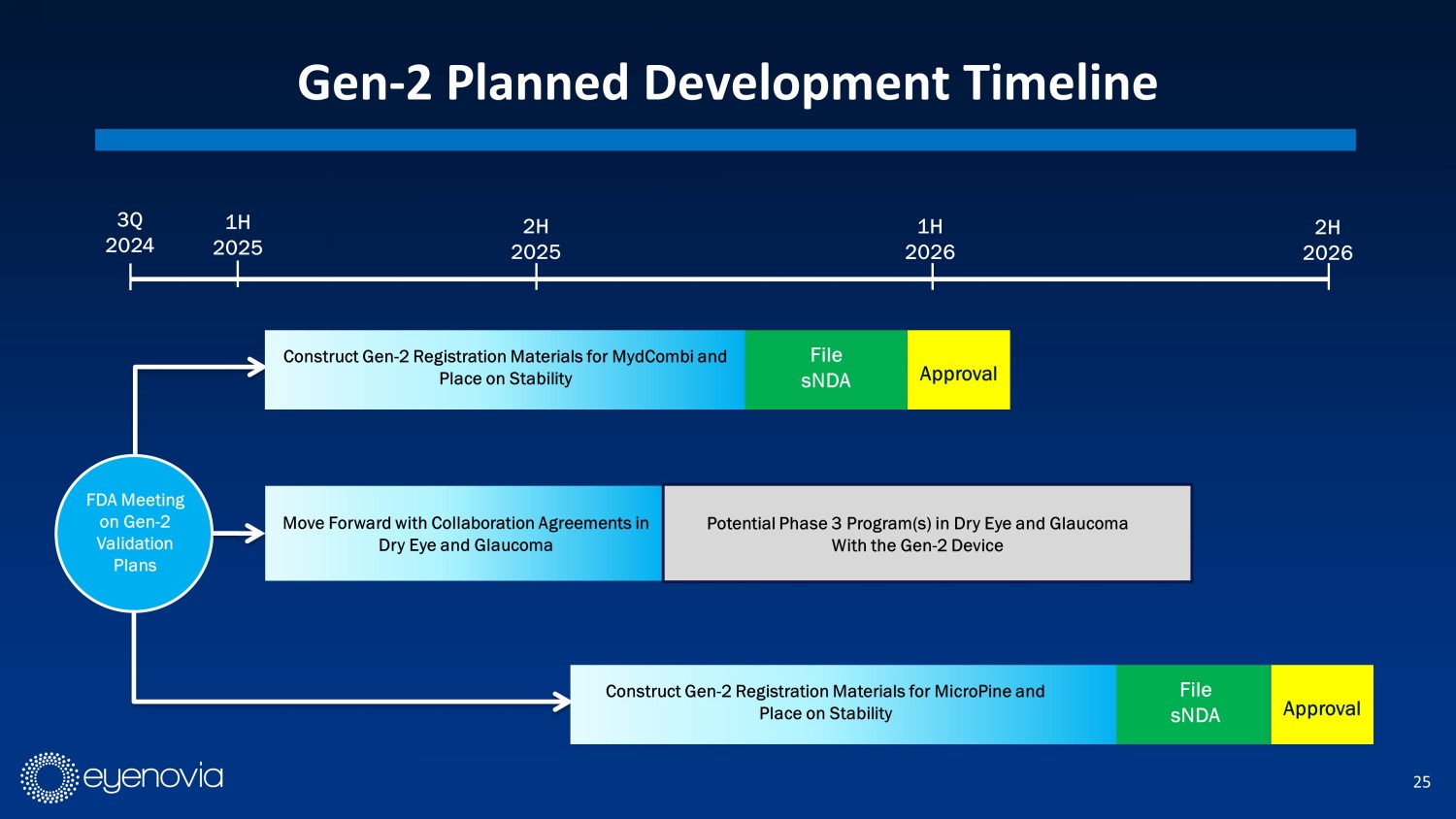 24 Multiple Licensing Opportunities in Large Markets 1. Estimates from IQVIA Sales Data | 2. Eyenovia Estimates chronic dry eye is 90% and acute is 10% of total dry eye market of $6 .1B (Dry Eye Disease Market (Jan 2024) Transparency Market Research. Available at: https://www.transparencymarketresearch.com/sample/sample.php?flag=S&rep_id=26096) Target Market Targeted Product Differentiation United States Addressable Market POTENTIAL OPPORTUNITIES Glaucoma Optejet: Optecare Œ service, Ease of use, Low side effect incidence $2.7B 1 Acute Dry Eye Optejet: New drug class, Ease of use, Fast onset $0.6B 2 Chronic Dry Eye Optejet: New MOA, Ease of use, Fast onset $5.5B 2 Presbyopia Optejet: Ease of use, consumer preference, low side effects $0.8B