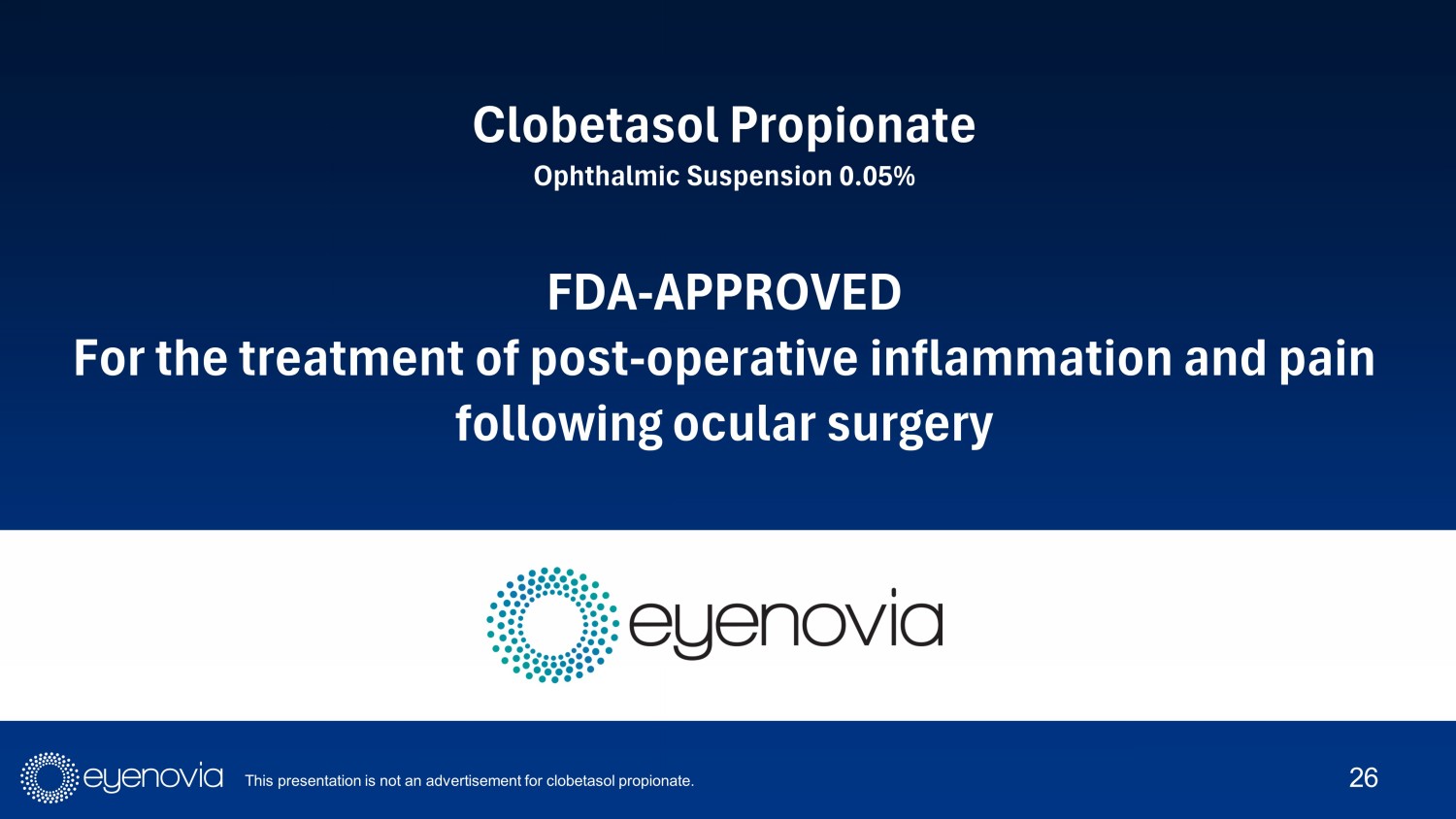 Clobetasol Propionate Ophthalmic Suspension 0.05% FDA - APPROVED For the treatment of post - operative inflammation and pain following ocular surgery 26 This presentation is not an advertisement for clobetasol propionate.