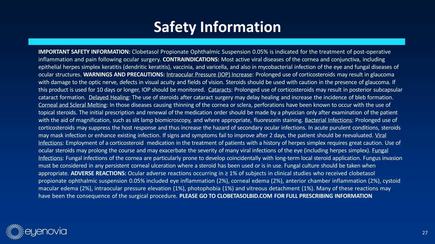 Safety Information IMPORTANT SAFETY INFORMATION: Clobetasol Propionate Ophthalmic Suspension 0.05% is indicated for the treatment of post - operative inflammation and pain following ocular surgery. CONTRAINDICATIONS: Most active viral diseases of the cornea and conjunctiva, including epithelial herpes simplex keratitis (dendritic keratitis), vaccinia, and varicella, and also in mycobacterial infection of th e e ye and fungal diseases of ocular structures. WARNINGS AND PRECAUTIONS: Intraocular Pressure (IOP) Increase : Prolonged use of corticosteroids may result in glaucoma with damage to the optic nerve, defects in visual acuity and fields of vision. Steroids should be used with caution in the pr ese nce of glaucoma. If this product is used for 10 days or longer, IOP should be monitored. Cataracts : Prolonged use of corticosteroids may result in posterior subcapsular cataract formation. Delayed Healing : The use of steroids after cataract surgery may delay healing and increase the incidence of bleb formation. Corneal and Scleral Melting : In those diseases causing thinning of the cornea or sclera, perforations have been known to occur with the use of topical steroids. The initial prescription and renewal of the medication order should be made by a physician only after exami nat ion of the patient with the aid of magnification, such as slit lamp biomicroscopy, and where appropriate, fluorescein staining. Bacterial Infections : Prolonged use of corticosteroids may suppress the host response and thus increase the hazard of secondary ocular infections. In acute purulent co nditions, steroids may mask infection or enhance existing infection. If signs and symptoms fail to improve after 2 days, the patient should be r eev aluated. Viral Infections : Employment of a corticosteroid medication in the treatment of patients with a history of herpes simplex requires great cau tio n. Use of ocular steroids may prolong the course and may exacerbate the severity of many viral infections of the eye (including herpes sim plex). Fungal Infections : Fungal infections of the cornea are particularly prone to develop coincidentally with long - term local steroid application. Fun gus invasion must be considered in any persistent corneal ulceration where a steroid has been used or is in use. Fungal culture should be tak en when appropriate. ADVERSE REACTIONS: Ocular adverse reactions occurring in ≥ 1% of subjects in clinical studies who received clobetasol propionate ophthalmic suspension 0.05% included eye inflammation (2%), corneal edema (2%), anterior chamber inflammation (2%) , c ystoid macular edema (2%), intraocular pressure elevation (1%), photophobia (1%) and vitreous detachment (1%). Many of these reactio ns may have been the consequence of the surgical procedure . PLEASE GO TO CLOBETASOLBID.COM FOR FULL PRESCRIBING INFORMATION 27