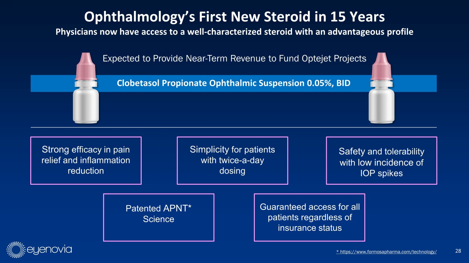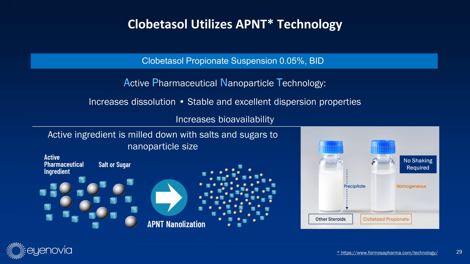 Expected to Provide Near - Term Revenue to Fund Optejet Projects 28 Ophthalmology’s First New Steroid in 15 Years Physicians now have access to a well - characterized steroid with an advantageous profile * https://www.formosapharma.com/technology/ Clobetasol Propionate Ophthalmic Suspension 0.05%, BID Strong efficacy in pain relief and inflammation reduction Safety and tolerability with low incidence of IOP spikes Simplicity for patients with twice - a - day dosing Patented APNT* Science Guaranteed access for all patients regardless of insurance status CD11