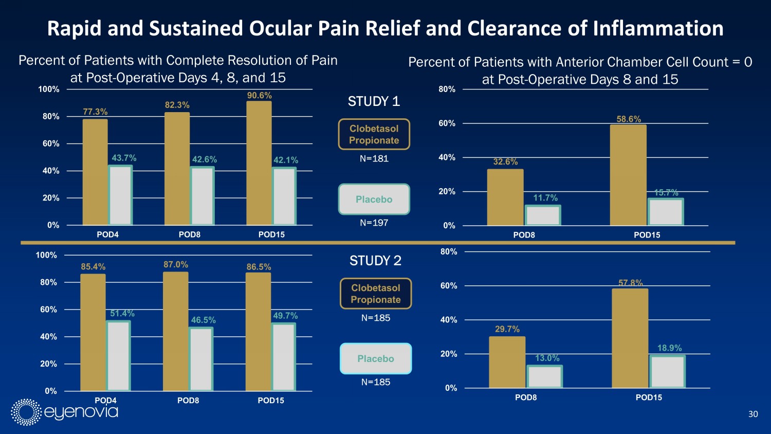 30 77.3% 82.3% 90.6% 43.7% 42.6% 42.1% 0% 20% 40% 60% 80% 100% POD4 POD8 POD15 Rapid and Sustained Ocular Pain Relief and Clearance of Inflammation Percent of Patients with Complete Resolution of Pain at Post - Operative Days 4, 8, and 15 85.4% 87.0% 86.5% 51.4% 46.5% 49.7% 0% 20% 40% 60% 80% 100% POD4 POD8 POD15 Percent of Patients with Anterior Chamber Cell Count = 0 at Post - Operative Days 8 and 15 32.6% 58.6% 11.7% 15.7% 0% 20% 40% 60% 80% POD8 POD15 29.7% 57.8% 13.0% 18.9% 0% 20% 40% 60% 80% POD8 POD15 Clobetasol Propionate Placebo N=181 N=197 STUDY 1 Clobetasol Propionate Placebo N=185 N=185 STUDY 2