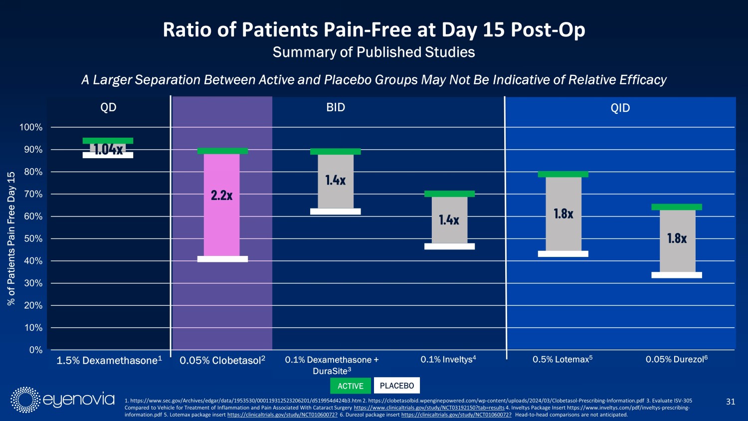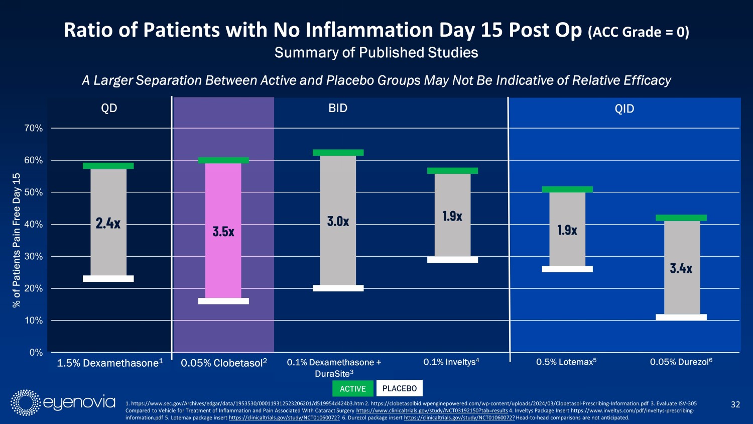 0% 10% 20% 30% 40% 50% 60% 70% 80% 90% 100% 1.5% Dexamethasone 0.05% Clobetasol 0.1% Dexamethasone + DuraSite 0.1 % Inveltys 0.5% Lotemax 0.05% Durezol % of Patients Pain Free Day 15 A Larger Separation Between Active and Placebo Groups May Not Be Indicative of Relative Efficacy 31 Ratio of Patients Pain - Free at Day 15 Post - Op Summary of Published Studies QD QID 2.2 x 1.4x 1.8 x 1.4 x 1.8 x 0.05% Clobetasol 2 0.1% Dexamethasone + DuraSite 3 0.1% Inveltys 4 0.5% Lotemax 5 0.05% Durezol 6 BID 1. https://www.sec.gov/Archives/edgar/data/1953530/000119312523206201/d519954d424b3.htm 2. https://clobetasolbid.wpenginepowe red .com/wp - content/uploads/2024/03/Clobetasol - Prescribing - Information.pdf 3 . Evaluate ISV - 305 Compared to Vehicle for Treatment of Inflammation and Pain Associated With Cataract Surgery https://www.clinicaltrials.gov/study/NCT03192150?tab=results 4. Inveltys Package Insert https://www.inveltys.com/pdf/inveltys - prescribing - information.pdf 5. Lotemax package insert https://clinicaltrials.gov/study/NCT01060072? 6. Durezol package insert https://clinicaltrials.gov/study/NCT01060072? Head - to - head comparisons are not anticipated. 1.04x 1.5% Dexamethasone 1 ACTIVE PLACEBO