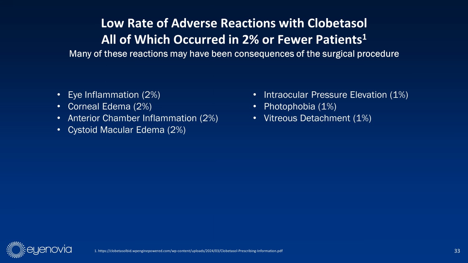 33 1. https://clobetasolbid.wpenginepowered.com/wp - content/uploads/2024/03/Clobetasol - Prescribing - Information.pdf Low Rate of Adverse Reactions with Clobetasol All of Which Occurred in 2% or Fewer Patients 1 Many of these reactions may have been consequences of the surgical procedure • E ye I nflammation (2%) • C orneal E dema (2%) • A nterior C hamber I nflammation (2%) • C ystoid M acular E dema (2%) • I ntraocular P ressure E levation (1%) • P hotophobia (1%) • V itreous D etachment (1%)