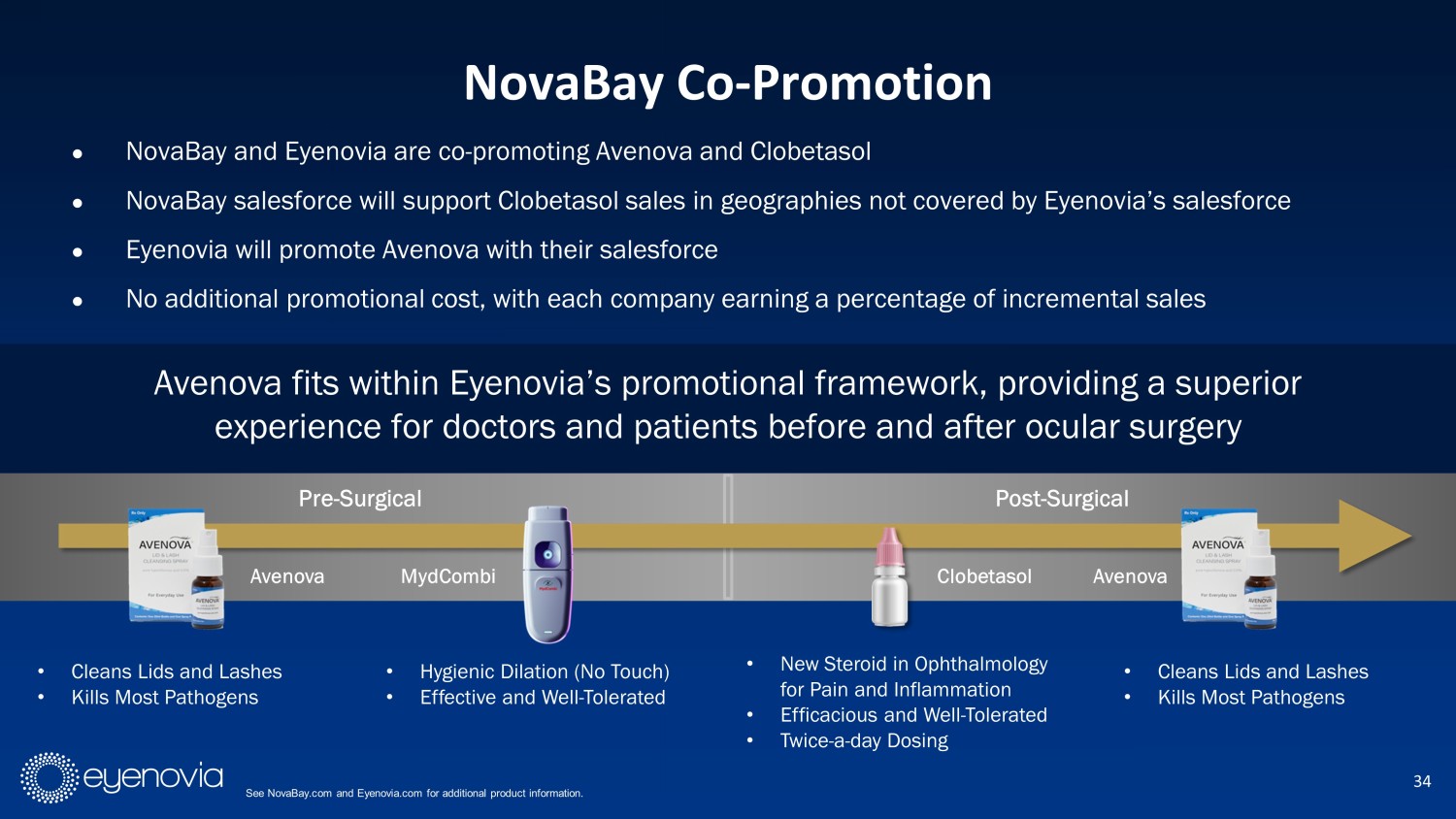 ● NovaBay and Eyenovia are co - promoting Avenova and Clobetasol ● NovaBay salesforce will support Clobetasol sales in geographies not covered by Eyenovia’s salesforce ● Eyenovia will promote Avenova with their salesforce ● No additional promotional cost, with each company earning a percentage of incremental sales Avenova fits within Eyenovia’s promotional framework, providing a superior experience for doctors and patients before and after ocular surgery 34 NovaBay Co - Promotion See NovaBay.com and Eyenovia.com for additional product information. Pre - Surgical Post - Surgical • Cleans Lids and Lashes • Kills Most Pathogens • Hygienic Dilation (No Touch) • Effective and Well - Tolerated • New Steroid in Ophthalmology for Pain and Inflammation • Efficacious and Well - Tolerated • Twice - a - day Dosing • Cleans Lids and Lashes • Kills Most Pathogens Avenova Clobetasol MydCombi Avenova