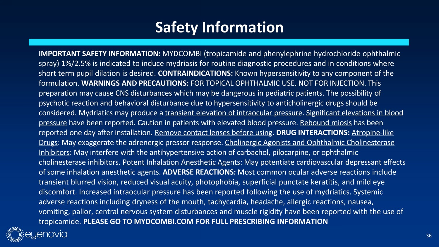 Safety Information IMPORTANT SAFETY INFORMATION: MYDCOMBI (tropicamide and phenylephrine hydrochloride ophthalmic spray) 1%/2.5% is indicated to induce mydriasis for routine diagnostic procedures and in conditions where short term pupil dilation is desired. CONTRAINDICATIONS: Known hypersensitivity to any component of the formulation. WARNINGS AND PRECAUTIONS: FOR TOPICAL OPHTHALMIC USE. NOT FOR INJECTION. This preparation may cause CNS disturbances which may be dangerous in pediatric patients. The possibility of psychotic reaction and behavioral disturbance due to hypersensitivity to anticholinergic drugs should be considered. Mydriatics may produce a transient elevation of intraocular pressure . Significant elevations in blood pressure have been reported. Caution in patients with elevated blood pressure. Rebound miosis has been reported one day after installation. Remove contact lenses before using . DRUG INTERACTIONS: Atropine - like Drugs : May exaggerate the adrenergic pressor response. Cholinergic Agonists and Ophthalmic Cholinesterase Inhibitors : May interfere with the antihypertensive action of carbachol, pilocarpine, or ophthalmic cholinesterase inhibitors. Potent Inhalation Anesthetic Agents : May potentiate cardiovascular depressant effects of some inhalation anesthetic agents. ADVERSE REACTIONS: Most common ocular adverse reactions include transient blurred vision, reduced visual acuity, photophobia, superficial punctate keratitis, and mild eye discomfort. Increased intraocular pressure has been reported following the use of mydriatics. Systemic adverse reactions including dryness of the mouth, tachycardia, headache, allergic reactions, nausea, vomiting, pallor, central nervous system disturbances and muscle rigidity have been reported with the use of tropicamide. PLEASE GO TO MYDCOMBI.COM FOR FULL PRESCRIBING INFORMATION 36