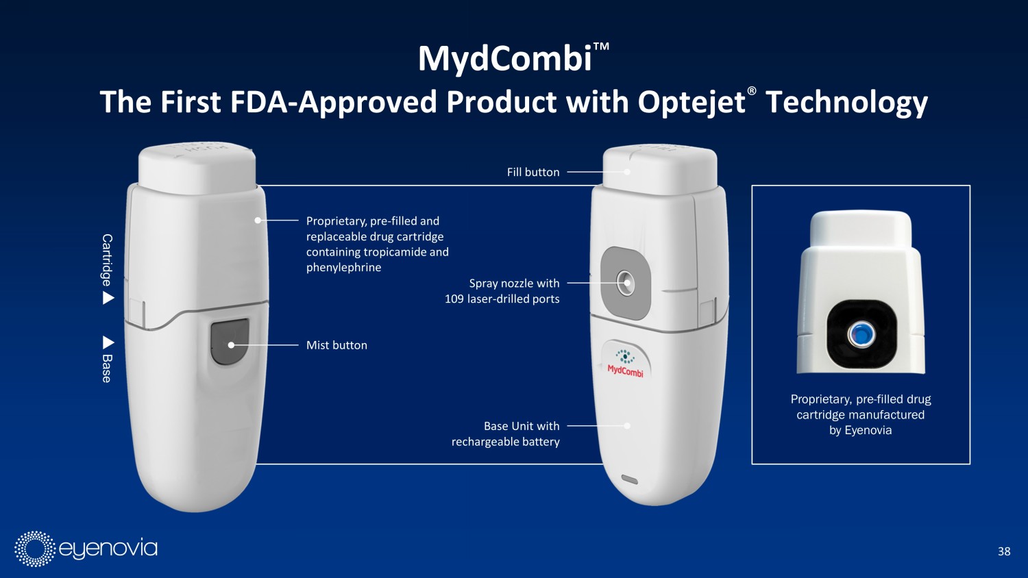 38 Spray nozzle with 109 laser - drilled ports Mist button Proprietary, pre - filled and replaceable drug cartridge containing tropicamide and phenylephrine Fill button Base Unit with rechargeable battery Cartridge Base Proprietary, pre - filled drug cartridge manufactured by Eyenovia MydCombi Ρ The First FDA - Approved Product with Optejet ® Technology