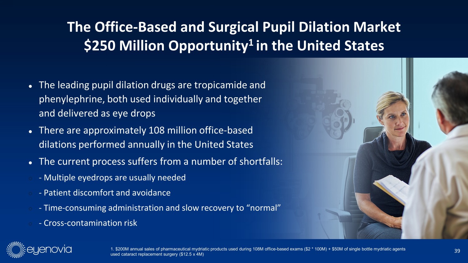 39 The Office - Based and Surgical Pupil Dilation Market $250 Million Opportunity 1 in the United States 1. $200M annual sales of pharmaceutical mydriatic products used during 108M office - based exams ($2 * 100M) + $50M of single bott le mydriatic agents used cataract replacement surgery ($12.5 x 4M) ● The leading pupil dilation drugs are tropicamide and phenylephrine, both used individually and together and delivered as eye drops ● There are approximately 108 million office - based dilations performed annually in the United States ● The current process suffers from a number of shortfalls: ○ - Multiple eyedrops are usually needed ○ - Patient discomfort and avoidance ○ - Time - consuming administration and slow recovery to “normal” ○ - Cross - contamination risk