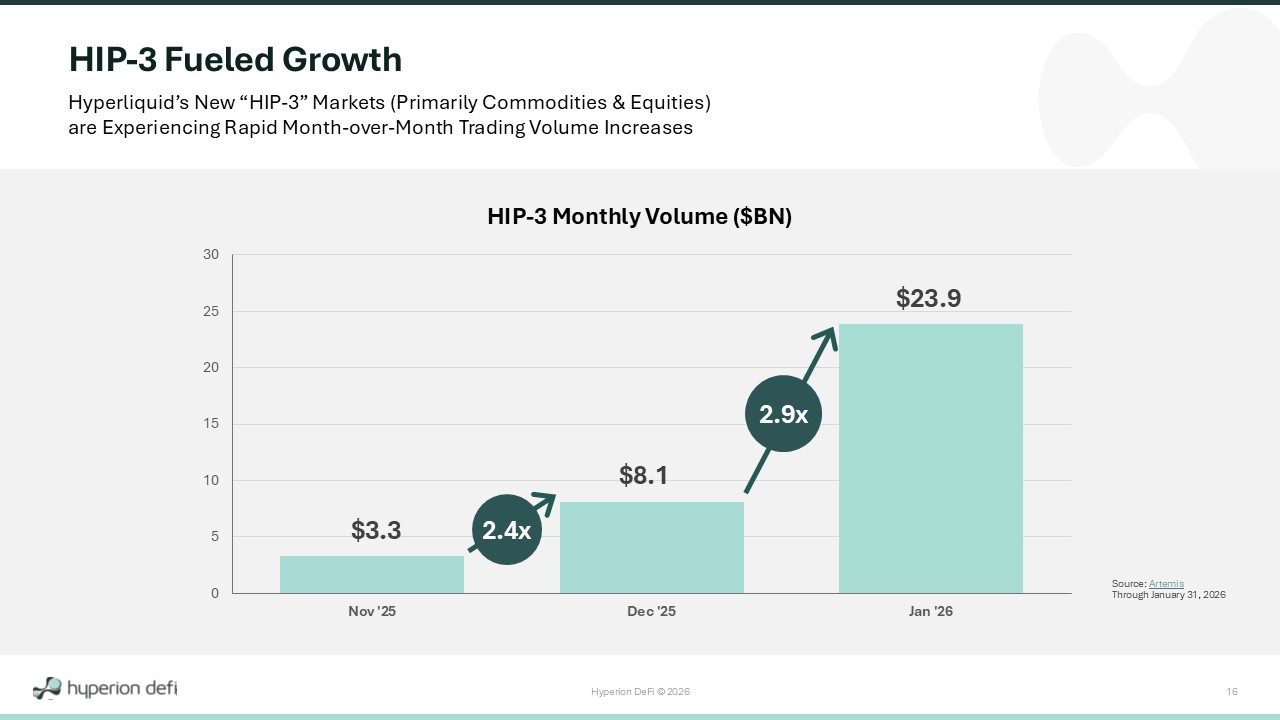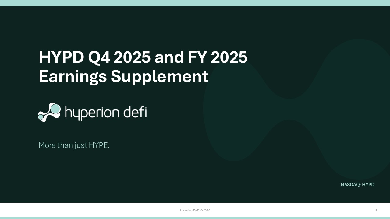 Hyperion DeFi © 2026 2 Use of Non - GAAP Financial Measures This presentation includes certain non - GAAP financial measures (including on a forward - looking basis) such as Adjusted Gross Profit, Gross HYPE Holdings, Net Asset Value, Operating Expenses Excluding Stock - Based Compensation, Treasury Gains (Losses), Adjusted Other Income (Expense), and Adjusted EBITDA. These non - GAAP measures are in addition to, and not a substitute for or superior to, measures of financial performance prepared in accordance with GAAP and should not be considered as an alternative to any performance measures derived in accordance with GAAP. Reconciliations of non - GAAP measures to their most directly comparable U.S. Generally Accepted Accounting Principles (GAAP) counterparts are included in the Financial Supplement - Non - GAAP Reconciliations section of this presentation with additional detail in the Footnotes. Hyperion DeFi believes that these non - GAAP measures of financial results (including on a forward - looking basis) provide useful supplemental information to investors about Hyperion DeFi. Hyperion DeFi’s management uses non - GAAP measures to evaluate our operating performance, formulate business plans, help better assess our overall liquidity position, and make strategic decisions, including those relating to operating expenses and the allocation of internal resources. However, these non - GAAP measures have limitations as analytical tools. Other companies may not use these non - GAAP measures or may use similar measures that are defined in a different manner. Therefore, Hyperion DeFi’s non - GAAP measures may not be directly comparable to similarly titled measures of other companies. We also periodically review our non - GAAP financial measures and may revise these measures to reflect changes in our business or otherwise. Additionally, forward - looking non - GAAP financial measures are presented on a non - GAAP basis without reconciliations of such forward - looking non - GAAP measures because the GAAP financial measures are not accessible on a forward - looking basis and reconciling information is not available without unreasonable effort due to the inherent difficulty in forecasting and quantifying certain amounts that are necessary for such reconciliations, including adjustments reflected in our reconciliation of historic non - GAAP financial measures, the amounts of which, based on historical experience, could be material. Forward - Looking Statements Except for historical information, all the statements, expectations and assumptions contained in this presentation are forwar d - l ooking statements. Forward - looking statements include, but are not limited to, statements that express our intentions, beliefs, expectations, strategies, predictions or any other statements, our future activities or ot her future events or conditions, including the estimated market opportunities for our platform technology, the viability of, and risks associated with, our cryptocurrency treasury strategy, and the growth and revenue pot ent ial of the Hyperliquid ecosystem and the growth prospects of Hyperion DeFi, Inc. (“Hyperion DeFi”, “Hyperion” or the “Company”) (NASDAQ:HYPD). These statements are based on current expectations, estimates and projecti ons about our business based, in part, on assumptions made by management. These statements are not guarantees of future performance and involve risks, uncertainties and assumptions that are difficult to pr edi ct. Therefore, actual outcomes and results may, and in some cases are likely to, differ materially from what is expressed or forecasted in the forward - looking statements due to numerous factors discussed from time to time in documents which we file with the U.S. Securities and Exchange Commission (the “SEC”), including in particular, the risks of our cryptocurrency strategy as detailed in our reports filed with the SEC. Any forward - looking statements speak only as of the date on which they are made, and except as may be required under applicable securities laws, Hyperion DeFi does not undertake any obligation to update any forward - looking statements. Disclaimer Certain information contained in this presentation and statements made orally during this presentation relate to or are based on studies, publications, surveys and other data obtained from third - party sources and Hyperion DeFi’s own internal estimates and research. While Hyperion DeFi believes these third - party studies, publications, surve ys and other data to be reliable as of the date of this presentation, it has not independently verified, and makes no representation as to the adequacy, fairness, accuracy or completeness of, any information obtained fro m t hird - party sources. In addition, no independent source has evaluated the reasonableness or accuracy of Hyperion DeFi’s internal estimates or research and no reliance should be made on any information or statements ma de in this presentation relating to or based on such internal estimates and research. You should conduct your own investigation and analysis of Hyperion DeFi, its business, prospects, results of operations and finan cia l condition. In furnishing this information, Hyperion DeFi does not undertake any obligation to provide you with access to any additional information (including forward - looking information and any projections contained he rein) or to update or correct the information. All figures in this presentation are not audited. Throughout this document, totals may not sum due to rounding. Calculations are based on unrounded results. Q4 2025 Q3 2025 Figures in $ 496,229 302,506 Revenue 820,997 439,386 Adjusted Gross Profit (1) 16,233,941 37,954,590 HYPE Digital Assets 47,837,901 77,751,604 Gross HYPE Holdings (4) 44,154,737 74,545,583 Net Asset Value (9) 4,530,542 2,594,130 Selling, General and Administrative Expense 3,007,135 4,315,016 Operating Expenses Excluding Stock - Based Comp