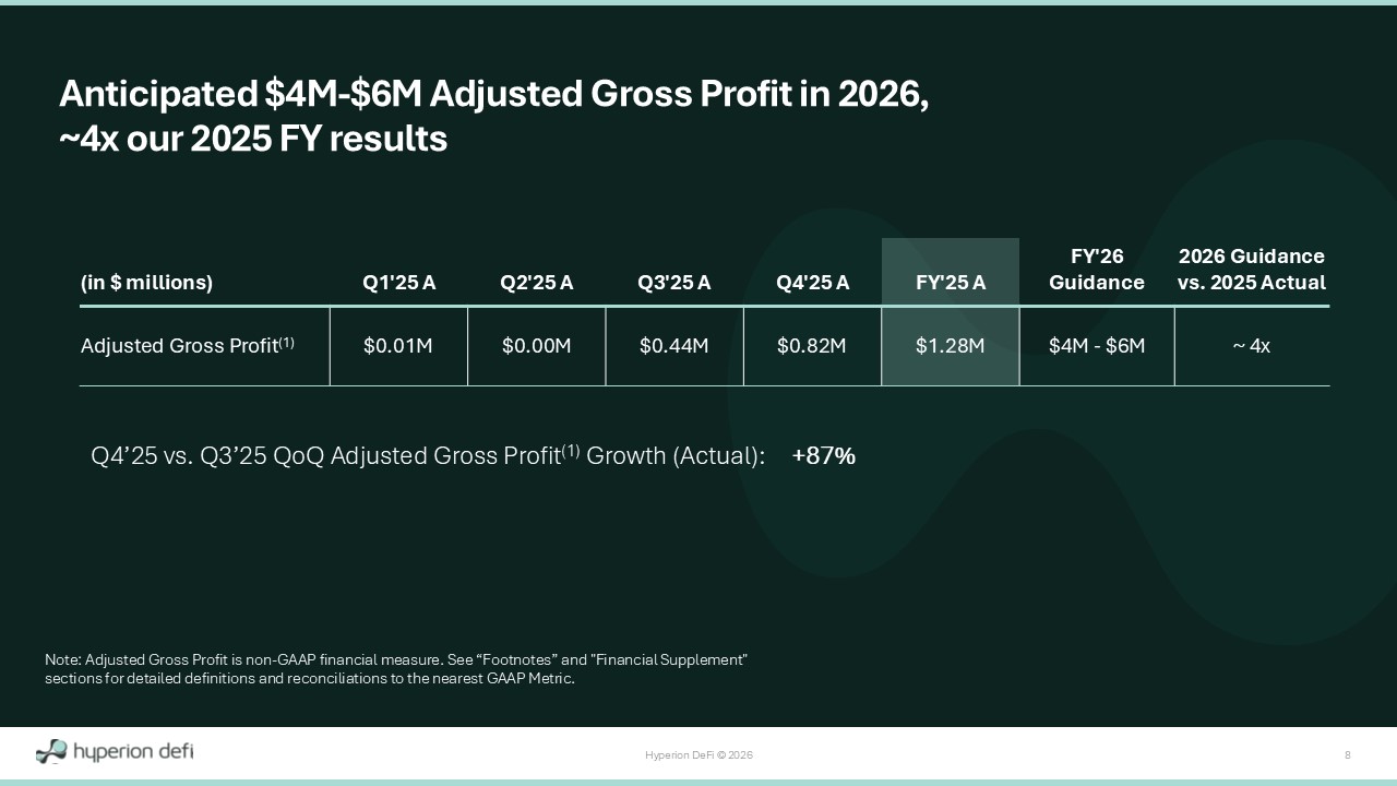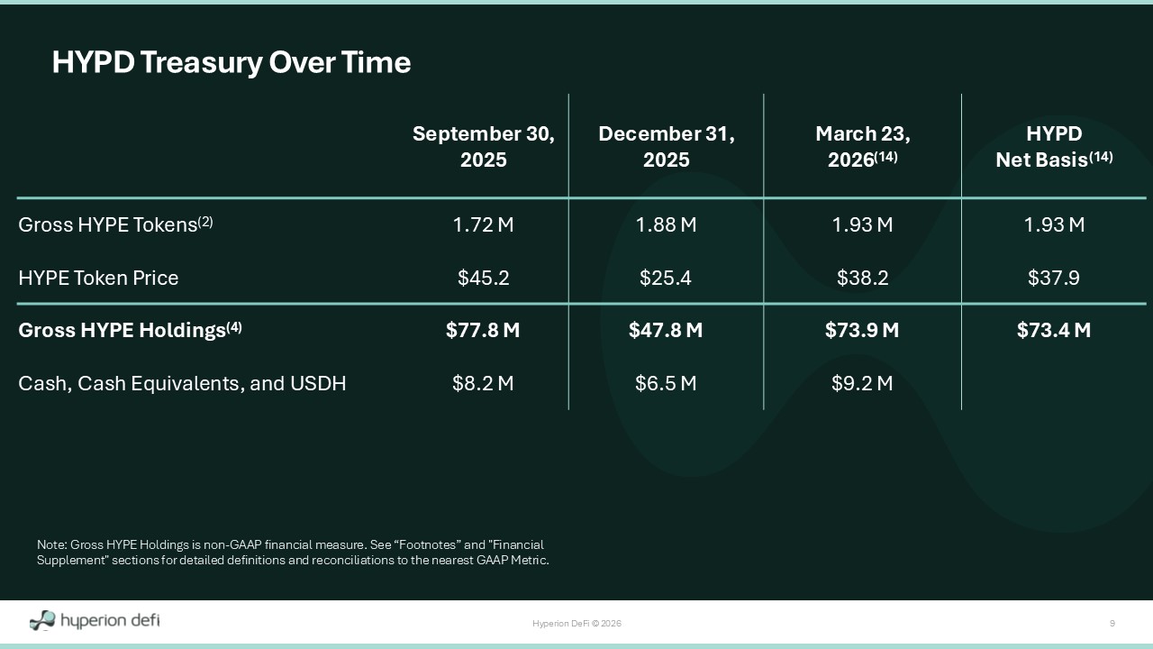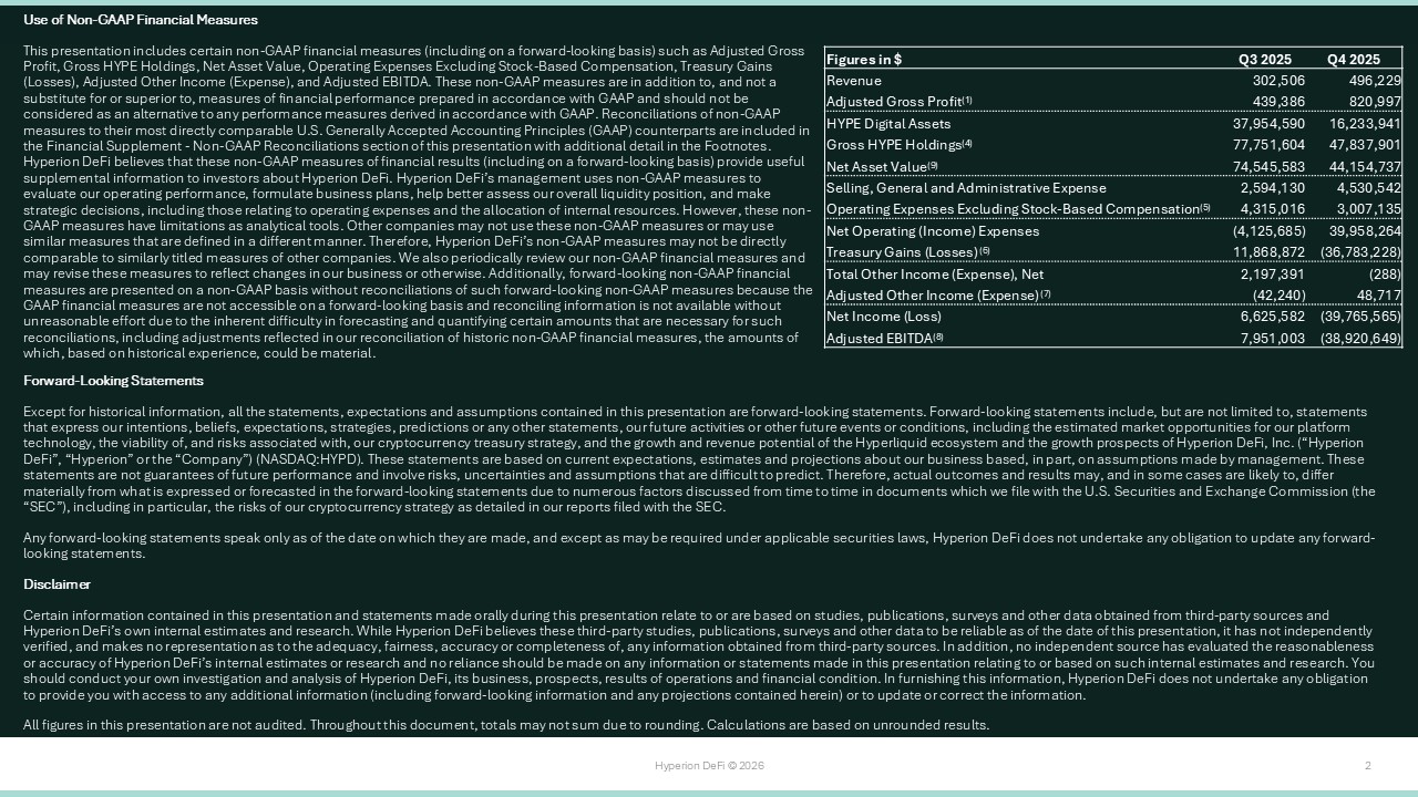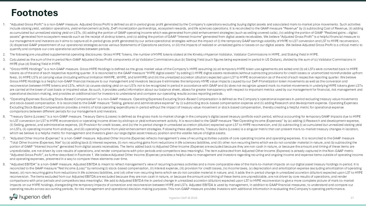 Hyperion DeFi © 2026 37 Footnotes 1. “Adjusted Gross Profit” is a non - GAAP measure. Adjusted Gross Profit is defined as all in - period gross profit generated by the C ompany’s operations excluding buying digital assets and associated mark - to - market price movements. Such activities include staking yield, validator operations, yield enhancement activity, DeFi monetization partnerships, ecosystem rewards, a nd life sciences operations. It is reconciled to the GAAP measure “Revenue” by ( i ) subtracting Cost of Revenue, (ii) adding accumulated but unrealized staking yield on LSTs, (iii) adding the portion of GAAP operating income which was generated from yie ld enhancement strategies (such as selling covered calls), (iv) adding the portion of GAAP “Realized gains – digital assets” generated from ecosystem rewards such as the receipt of airdrop tokens, and (v) adding the portion of GAAP “Interest Inc ome” generated from digital assets receivables. We believe “Adjusted Gross Profit” is a helpful financial measure to our management and investors as it aims to capture all in - period gross profit generated by our active operational strategies wit hout the impact of ( i ) the temporary GAAP earnings volatility of HYPE to LST conversion and LST to HYPE reconversion, (ii) dispersed GAAP presentment of our operational strategies across various Statements of Operations sections, or (iii) the imp acts of realized or unrealized gains or losses on our digital assets. We believe Adjusted Gross Profit is a critical metric t o quantify and compare our core operational activities between periods. 2. The following are unaudited supplemental operating disclosures: Gross HYPE Tokens, the number of HYPE tokens staked at the Ki net iq x Hyperion Validator, Validator Commissions in HYPE, and Staking Yield in HYPE. 3. Calculated as the sum of the in - period Non - GAAP Adjusted Gross Profit components of (a) Validator Commissions plus (b) Staking Y ield (such figures being expressed in - period in US Dollars), divided by the sum of (c) Validator Commissions in HYPE plus (d) Staking Yield in HYPE. 4. “Gross HYPE Holdings” is a non - GAAP measure. Gross HYPE Holdings is defined as the gross market value of the Company’s HYPE assu ming (a) all temporary HYPE token use agreements are exited and (b) all LSTs were converted back to HYPE tokens as of the end of each respective reporting quarter. It is reconciled to the GAAP measure “HYPE digital assets” by addi ng ( i ) HYPE digital assets receivable (without subtracting provisions for credit losses or unamortized nonrefundable upfront fees), (ii) HYPE LSTs at carrying value (including without limitation HiHYPE, kHYPE, and kmHYPE) and (iii) the unrealized accret ion (dilution) expected upon LST to HYPE reconversion as of the end of each respective reporting quarter. We believe Gross HYPE Holdings is a helpful non - GAAP financial measure to our management and investors because it eliminates the temporary HYPE value impacts caused by our DeFi Monetization token movements as well as the conversion and reconversion between HYPE tokens and LSTs, which (a) causes staking yield on our LSTs not to be recognized in - period in accordan ce with GAAP and (b) does not recognize upward mark - to - market movements in underlying HYPE tokens given LSTs are carried at the lower of cost basis or impaired value. As such, it provides useful information about our balance sheet, al low s for greater transparency with respect to important metrics used by our management for financial, risk management and operational decision - making, and provides an additional tool for investors to understand and compare our operating results acros s reporting periods. 5. "Operating Expenses Excluding Stock - Based Compensation" is a non - GAAP measure. Operating Expenses Excluding Stock - Based Compensa tion is defined as the Company's operational expenses in - period excluding treasury value movements and stock - based compensation. It is reconciled to the GAAP measure “Selling, general and administrative expense” by ( i ) subtracting stock - based compensation expense and (ii) adding Research and development expense. Operating Expenses Excluding Stock - Based Compensation provides a metric of total operating expenditures in - period without the impact of treasury va lue movement or stock - based compensation, thereby creating a helpful metric for operational expense comparisons between different periods for our management and investors. 6. "Treasury Gains (Losses)" is a non - GAAP measure. Treasury Gains (Losses) is defined as the gross mark - to - market change in the co mpany's digital asset treasury portfolio each period, without accounting for temporary GAAP impacts due to HYPE to LST conversion (or LST to HYPE reconversion) or operating income driven by airdrops or yield enhancement activity. It is r eco nciled to the GAAP measure “Net Operating Income (Expenses)" by (a) adding ( i ) Research and development expense, (ii) Selling, general, and administrative expense, (iii) Provision for credit losses, and (iv) the in - period change in unrealize d accretion (dilution) expected upon LST to HYPE reconversion, and (b) subtracting ( i ) accumulated but unrealized staking yield on LSTs, (ii) operating income from airdrops, and (iii) operating income from yield enhancement strategies. Following these a dju stments, Treasury Gains (Losses) is a singular metric that can present mark - to - market treasury changes in isolation, which we believe is a helpful metric for management and investors given our large digital asset treasury position and the vol ati le nature of digital assets. 7. "Adjusted Other Income (Expense)" is a non - GAAP measure. Adjusted Other Income (Expense) reflects management’s view of recurring activities outside of core operating income and operating expenses. It is reconciled to the GAAP measure "Total Other Income (Expense), Net" by (a)
