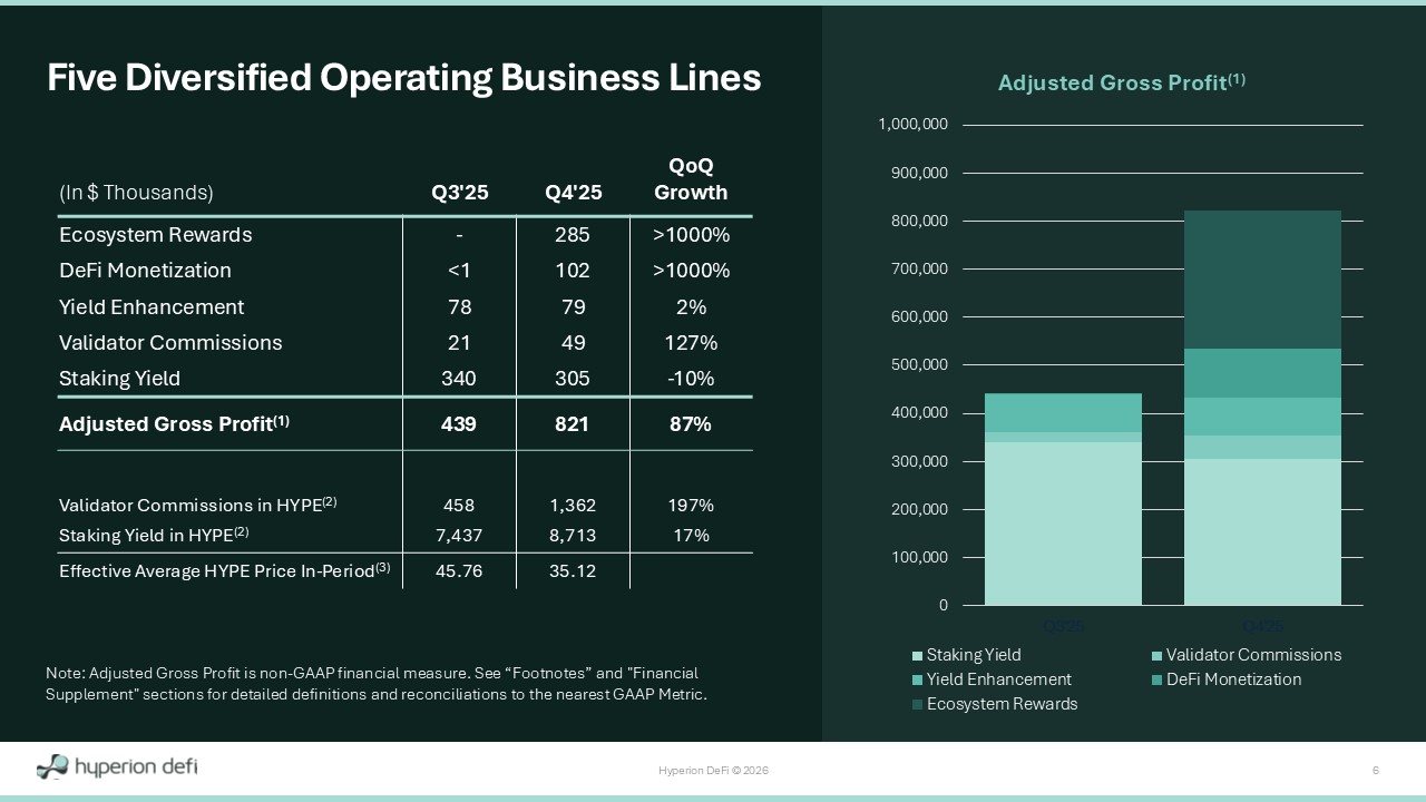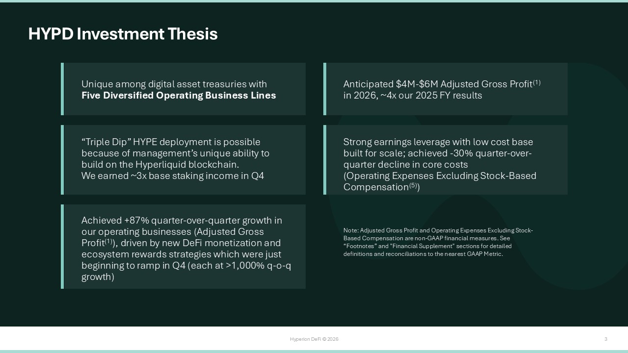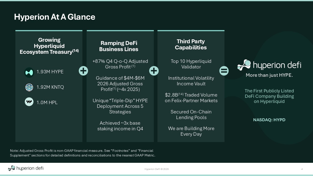 Hyperion DeFi © 2026 3 Achieved +87% quarter - over - quarter growth in our operating businesses (Adjusted Gross Profit (1) ), driven by new DeFi monetization and ecosystem rewards strategies which were just beginning to ramp in Q4 (each at >1,000% q - o - q growth) HYPD Investment Thesis Note: Adjusted Gross Profit and Operating Expenses Excluding Stock - Based Compensation are non - GAAP financial measures. See “Footnotes” and "Financial Supplement" sections for detailed definitions and reconciliations to the nearest GAAP Metric. “Triple Dip” HYPE deployment is possible because of management’s unique ability to build on the Hyperliquid blockchain. We earned ~3x base staking income in Q4 Strong earnings leverage with low cost base built for scale; achieved - 30% quarter - over - quarter decline in core costs (Operating Expenses Excluding Stock - Based Compensation (5) ) Anticipated $4M - $6M Adjusted Gross Profit (1) in 2026, ~4x our 2025 FY results Unique among digital asset treasuries with Five Diversified Operating Business Lines