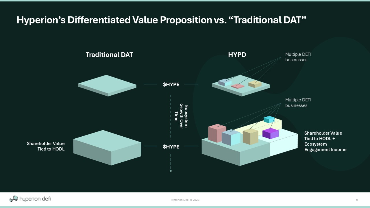 Hyperion DeFi © 2026 4 Top 10 Hyperliquid Validator Institutional Volatility Income Vault $2.8B (14) Traded Volume on Felix - Partner Markets Secured On - Chain Lending Pools We are Building More Every Day Growing Hyperliquid Ecosystem Treasury (14) Ramping DeFi Business Lines Third Party Capabilities + + = Hyperion At A Glance +87% Q4 Q - o - Q Adjusted Gross Profit (1) Guidance of $4M - $6M 2026 Adjusted Gross Profit (1) (~4x 2025) Unique “Triple - Dip” HYPE Deployment Across 5 Strategies Achieved ~3x base staking income in Q4 1.93M HYPE 1.92M KNTQ 1.0M HPL The First Publicly Listed DeFi Company Building on Hyperliquid NASDAQ: HYPD More than just HYPE. Note: Adjusted Gross Profit is non - GAAP financial measure. See “Footnotes” and "Financial Supplement" sections for detailed definitions and reconciliations to the nearest GAAP Metric.