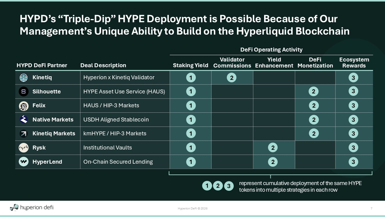 Hyperion DeFi © 2026 6 Five Diversified Operating Business Lines QoQ Growth Q4'25 Q3'25 (In $ Thousands) >1000% 285 - Ecosystem Rewards >1000% 102 <1 DeFi Monetization 2% 79 78 Yield Enhancement 127% 49 21 Validator Commissions - 10% 305 340 Staking Yield 87% 821 439 Adjusted Gross Profit (1) 197% 1,362 458 Validator Commissions in HYPE (2) 17% 8,713 7,437 Staking Yield in HYPE (2) 35.12 45.76 Effective Average HYPE Price In - Period (3) 0 100,000 200,000 300,000 400,000 500,000 600,000 700,000 800,000 900,000 1,000,000 Q3'25 Q4'25 Adjusted Gross Profit (1) Staking Yield Validator Commissions Yield Enhancement DeFi Monetization Ecosystem Rewards Note: Adjusted Gross Profit is non - GAAP financial measure. See “Footnotes” and "Financial Supplement" sections for detailed definitions and reconciliations to the nearest GAAP Metric.