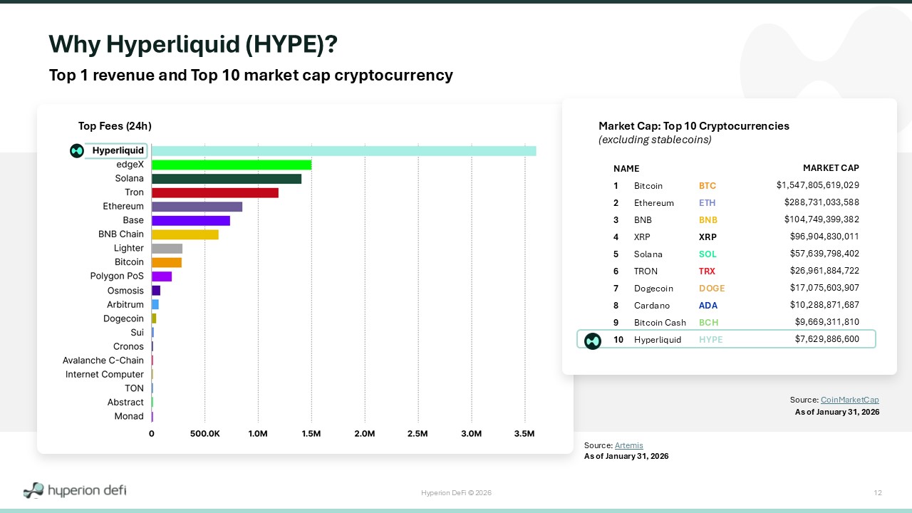 Hyperion DeFi © 2026 12 [ Why Hyperliquid (HYPE)? Top 1 revenue and Top 10 market cap cryptocurrency Source: CoinMarketCap Source: Artemis As of January 31, 2026 As of January 31, 2026 Top Fees (24h) [ NAME 1 Bitcoin BTC 2 Ethereum ETH 3 BNB BNB 4 XRP XRP 5 Solana SOL 6 TRON TRX 7 Dogecoin DOGE 8 Cardano ADA 9 Bitcoin Cash BCH 10 Hyperliquid HYPE Market Cap: Top 10 Cryptocurrencies (excluding stablecoins) MARKET CAP $1,547,805,619,029 $288,731,033,588 $104,749,399,382 $96,904,830,011 $57,639,798,402 $26,961,884,722 $17,075,603,907 $10,288,871,687 $9,669,311,810 $7,629,886,600