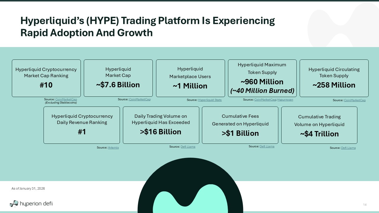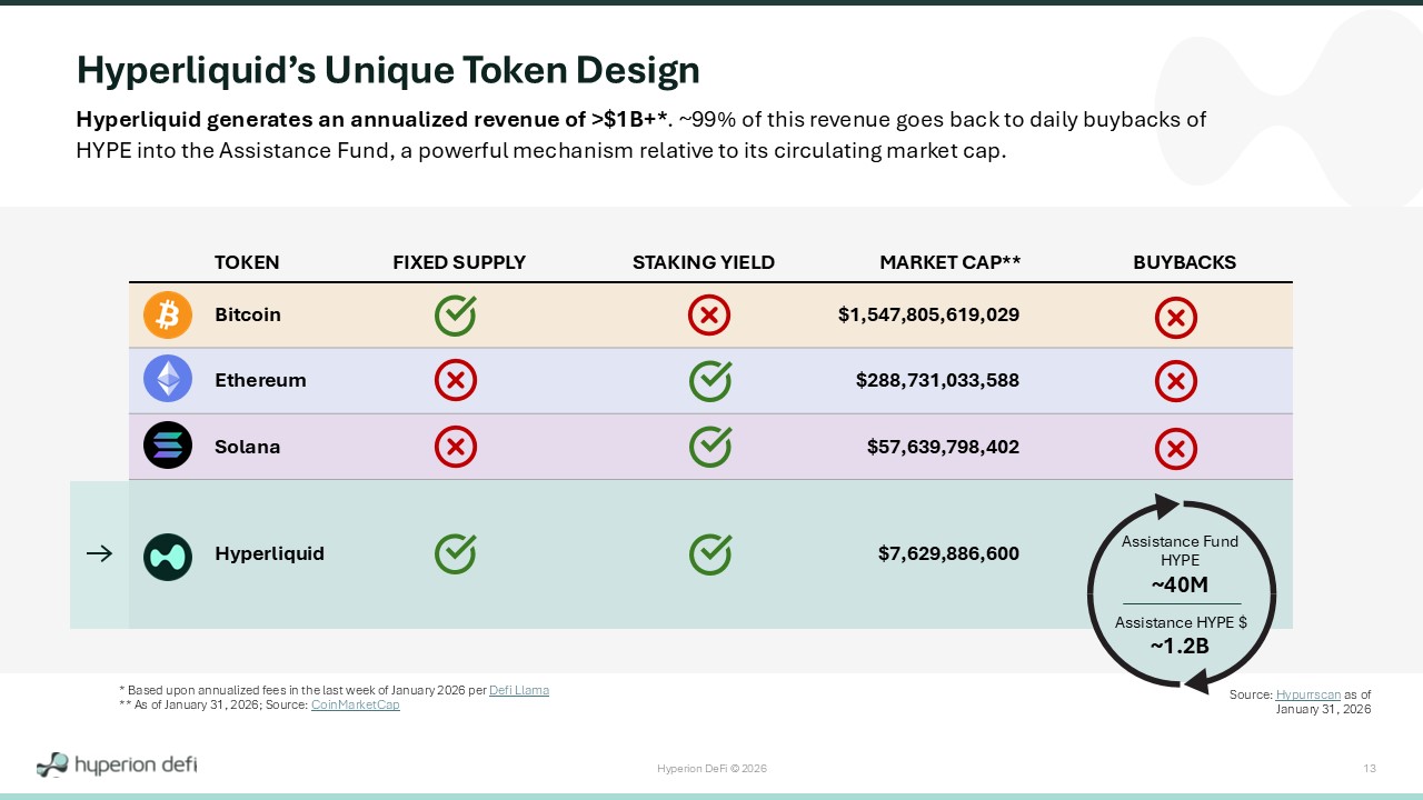 Hyperion DeFi © 2026 13 BUYBACKS MARKET CAP** STAKING YIELD FIXED SUPPLY TOKEN $1,547,805,619,029 Bitcoin $288,731,033,588 Ethereum $57,639,798,402 Solana $7,629,886,600 Hyperliquid Hyperliquid’s Unique Token Design Hyperliquid generates an annualized revenue of > $ 1 B+* . ~ 99 % of this revenue goes back to daily buybacks of HYPE into the Assistance Fund, a powerful mechanism relative to its circulating market cap . Assistance Fund HYPE ~40M Assistance HYPE $ ~1.2B Source: Hypurrscan as of January 31, 2026 * Based upon annualized fees in the last week of January 2026 per Defi Llama ** As of January 31, 2026; Source: CoinMarketCap