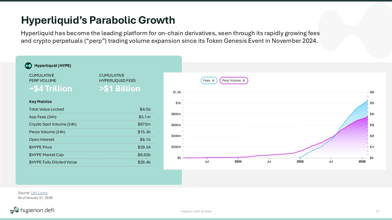 Hyperion DeFi © 2026 14 Hyperliquid’s (HYPE) Trading Platform Is Experiencing Rapid Adoption And Growth Hyperliquid Cryptocurrency Market Cap Ranking #10 Hyperliquid Market Cap ~$7.6 Billion Cumulative Fees Generated on Hyperliquid >$1 Billion Hyperliquid Circulating Token Supply ~258 Million Hyperliquid Marketplace Users ~1 Million Hyperliquid Maximum Token Supply ~960 Million (~40 Million Burned) Hyperliquid Cryptocurrency Daily Revenue Ranking #1 Source: Hyperliquid Stats Source: Defi Llama Source: Defi Llama Source: CoinMarketCap Source: CoinMarketCap ; Hypurrscan Source: CoinMarketCap Source: CoinMarketCap (Excluding Stablecoins) Source: Artemis As of January 31, 2026 Daily Trading Volume on Hyperliquid Has Exceeded >$16 Billion Cumulative Trading Volume on Hyperliquid ~$4 Trillion Source: Defi Llama