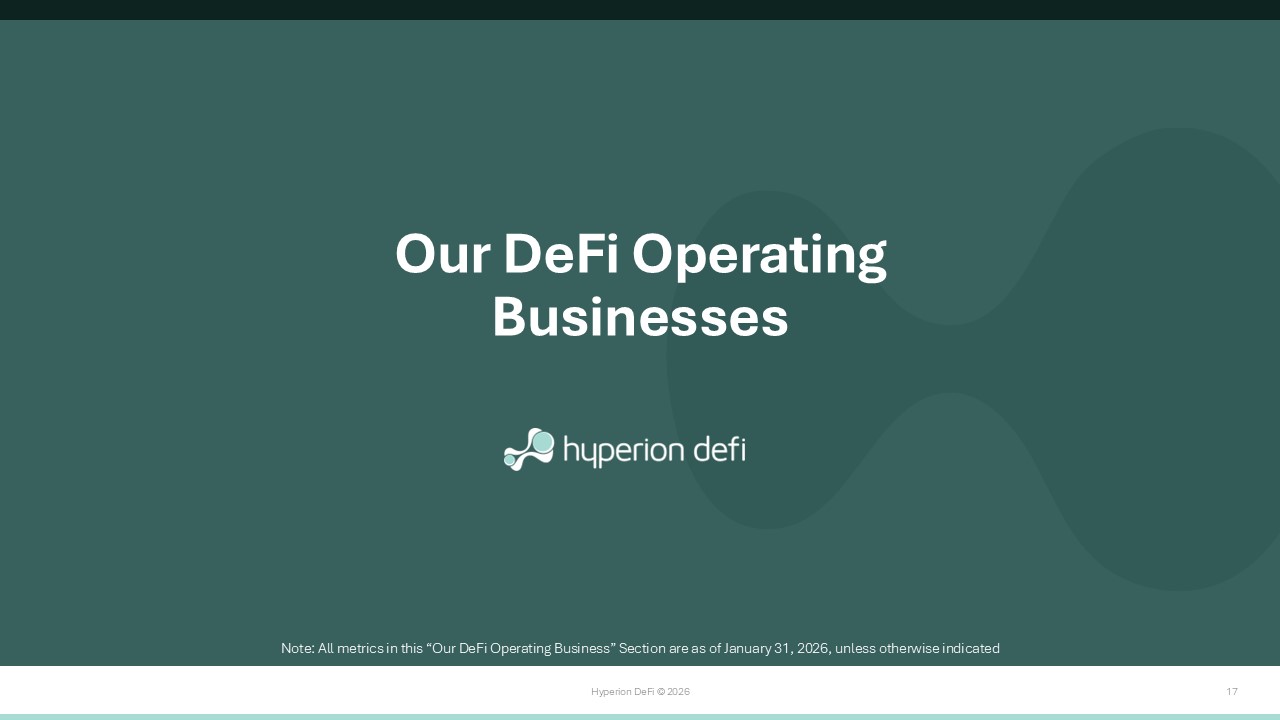 Hyperion DeFi © 2026 17 Our DeFi Operating Businesses Note: All metrics in this “Our DeFi Operating Business” Section are as of January 31, 2026, unless otherwise indicated