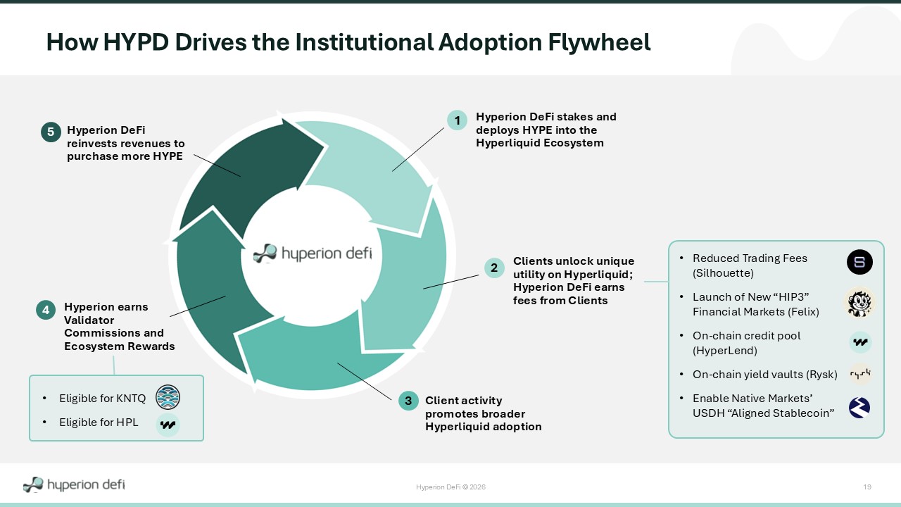 Hyperion DeFi © 2026 18 Early Mover Advantages Create Unique Opportunities for Compounding Revenue Streams Hyperliquid Staking Yield Validator Commissions Hyperliquid Staking Yield Hyperliquid Staking Yield Validator Commissions Yield Enhancement Validator Commissions Yield Enhancement Hyperliquid Staking Yield DeFi Monetization Validator Commissions Yield Enhancement Hyperliquid Staking Yield DeFi Monetization Ecosystem Rewards RETURNS HYPERION DEFI’S RAPIDLY COMPOUNDING DEFI STRATEGY Received 3M Foundation HYPE Delegation *Not active as of January 2026 HAUS Credo Execution* HAUS Felix Execution Co - Branded Kinetiq Validator Launched “HiHYPE” Liquid Staking Token Native Markets Partnership Rysk Yield Vaults HyperLend On - Chain Credit HAUS Silhouette Execution