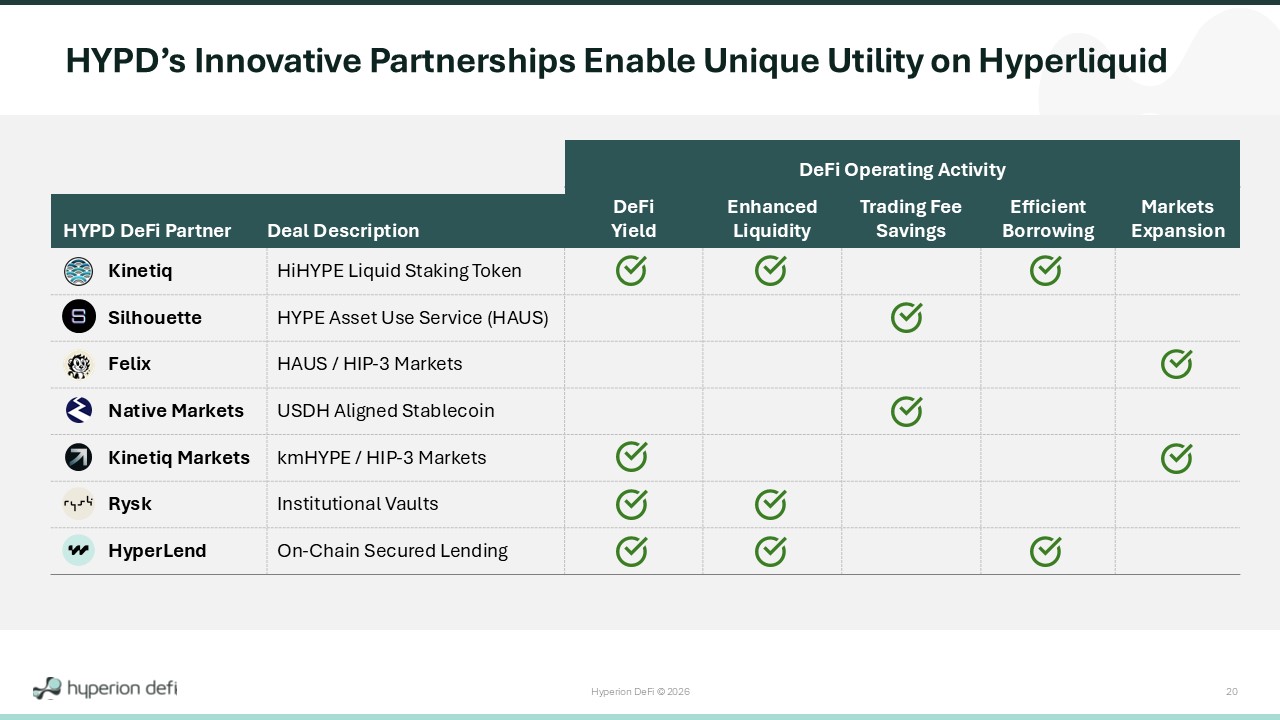 Hyperion DeFi © 2026 19 Hyperion DeFi stakes and deploys HYPE into the Hyperliquid Ecosystem Clients unlock unique utility on Hyperliquid; Hyperion DeFi earns fees from Clients Client activity promotes broader Hyperliquid adoption Hyperion earns Validator Commissions and Ecosystem Rewards Hyperion DeFi reinvests revenues to purchase more HYPE How HYPD Drives the Institutional Adoption Flywheel • Reduced Trading Fees (Silhouette) • Launch of New “HIP3” Financial Markets (Felix) • On - chain credit pool (HyperLend) • On - chain yield vaults (Rysk) • Enable Native Markets’ USDH “Aligned Stablecoin” 1 2 3 4 5 • Eligible for KNTQ • Eligible for HPL
