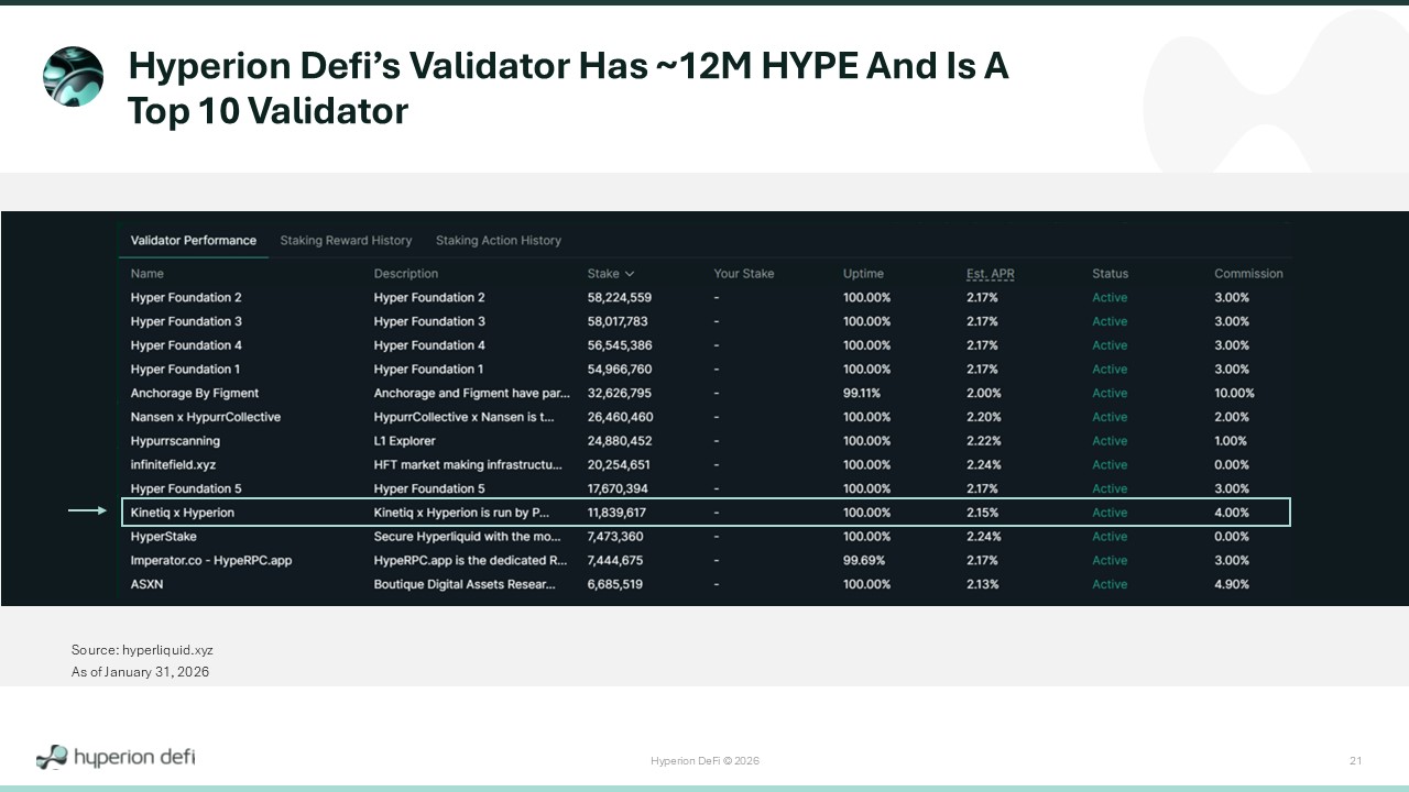 Hyperion DeFi © 2026 21 As of January 31, 2026 Source: hyperliquid.xyz As of January 31, 2026 Hyperion Defi’s Validator Has ~12M HYPE And Is A Top 10 Validator