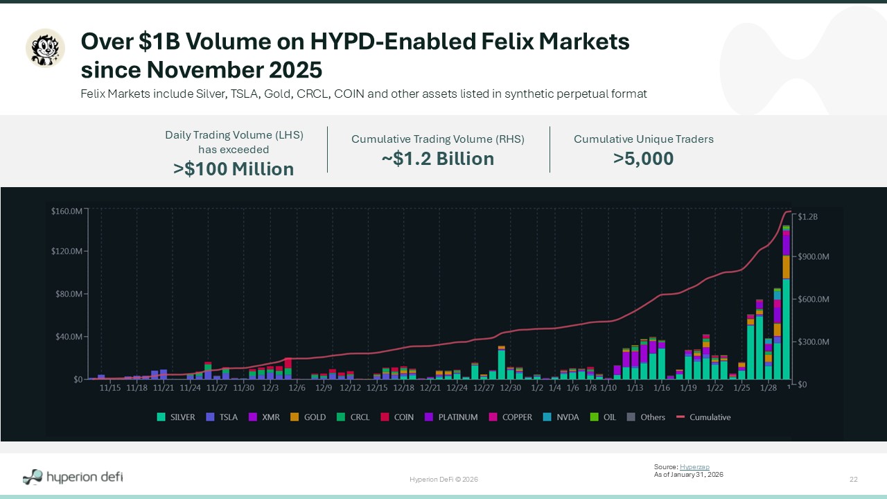 Hyperion DeFi © 2026 22 Over $1B Volume on HYPD - Enabled Felix Markets since November 2025 Felix Markets include Silver, TSLA, Gold, CRCL, COIN and other assets listed in synthetic perpetual format Source: Hyperzap As of January 31, 2026 Cumulative Trading Volume (RHS) ~$1.2 Billion Daily Trading Volume (LHS) has exceeded >$100 Million Cumulative Unique Traders >5,000