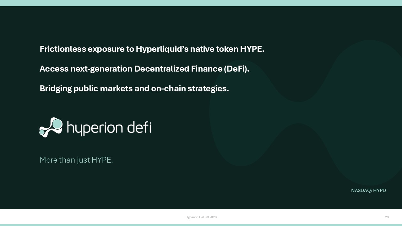 Hyperion DeFi © 2026 23 Frictionless exposure to Hyperliquid’s native token HYPE. Access next - generation Decentralized Finance (DeFi). Bridging public markets and on - chain strategies. More than just HYPE. NASDAQ: HYPD