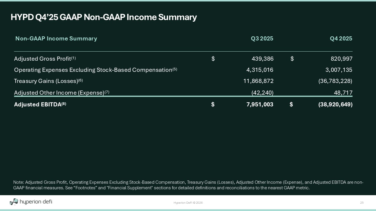 Hyperion DeFi © 2026 25 HYPD Q4’25 GAAP Non - GAAP Income Summary Note: Adjusted Gross Profit, Operating Expenses Excluding Stock - Based Compensation, Treasury Gains (Losses), Adjusted Other Inco me (Expense), and Adjusted EBITDA are non - GAAP financial measures. See “Footnotes” and "Financial Supplement" sections for detailed definitions and reconciliations to the nearest GAAP metric. Q4 2025 Q3 2025 Non - GAAP Income Summary $ 820,997 $ 439,386 Adjusted Gross Profit (1) 3,007,135 4,315,016 Operating Expenses Excluding Stock - Based Compensation (5) (36,783,228) 11,868,872 Treasury Gains (Losses) (6) 48,717 (42,240) Adjusted Other Income (Expense) (7) $ (38,920,649) $ 7,951,003 Adjusted EBITDA (8)