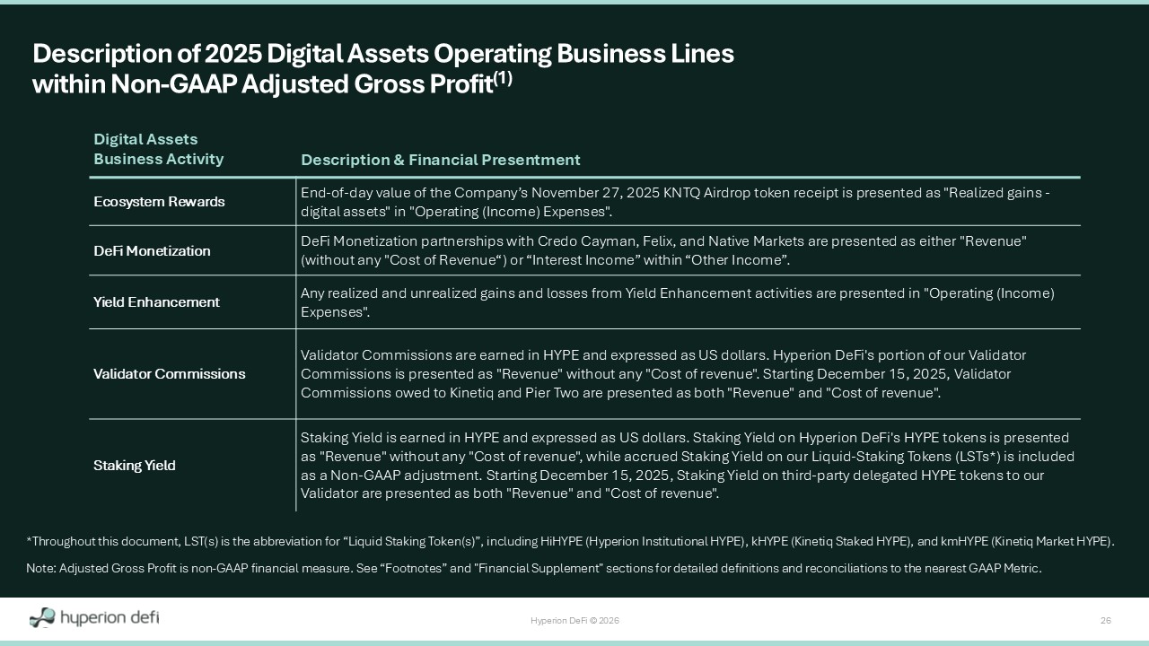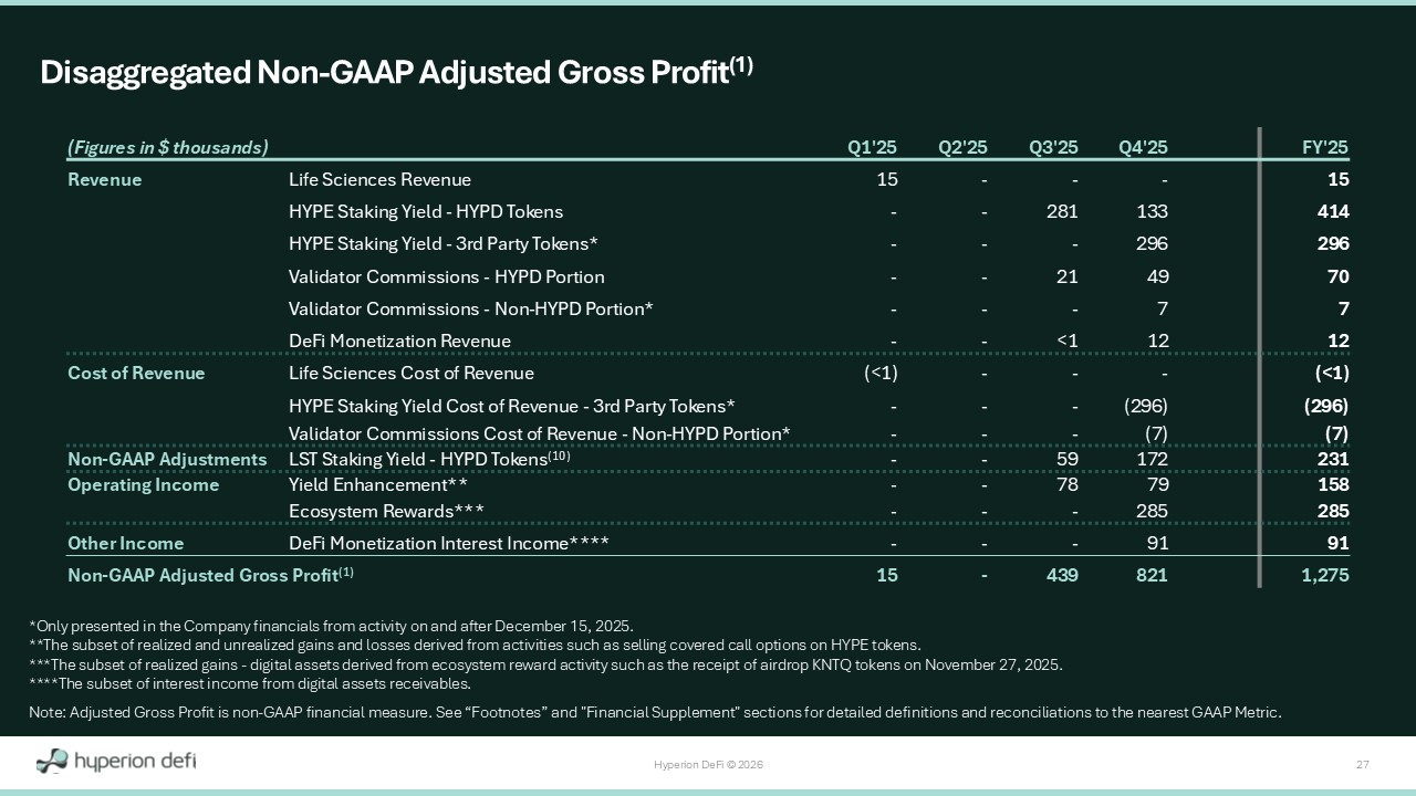 Hyperion DeFi © 2026 26 Description of 2025 Digital Assets Operating Business Lines within Non - GAAP Adjusted Gross Profit (1) *Throughout this document, LST(s) is the abbreviation for “Liquid Staking Token(s)”, including HiHYPE (Hyperion Institutional HY PE), kHYPE (Kinetiq Staked HYPE), and kmHYPE (Kinetiq Market HYPE). Note: Adjusted Gross Profit is non - GAAP financial measure. See “Footnotes” and "Financial Supplement" sections for detailed defi nitions and reconciliations to the nearest GAAP Metric. Description & Financial Presentment Digital Assets Business Activity End - of - day value of the Company’s November 27, 2025 KNTQ Airdrop token receipt is presented as "Realized gains - digital assets" in "Operating (Income) Expenses". Ecosystem Rewards DeFi Monetization partnerships with Credo Cayman, Felix, and Native Markets are presented as either "Revenue" (without any "Cost of Revenue“) or “Interest Income” within “Other Income”. DeFi Monetization Any realized and unrealized gains and losses from Yield Enhancement activities are presented in "Operating (Income) Expenses". Yield Enhancement Validator Commissions are earned in HYPE and expressed as US dollars. Hyperion DeFi's portion of our Validator Commissions is presented as "Revenue" without any "Cost of revenue". Starting December 15, 2025, Validator Commissions owed to Kinetiq and Pier Two are presented as both "Revenue" and "Cost of revenue". Validator Commissions Staking Yield is earned in HYPE and expressed as US dollars. Staking Yield on Hyperion DeFi's HYPE tokens is presented as "Revenue" without any "Cost of revenue", while accrued Staking Yield on our Liquid - Staking Tokens (LSTs*) is included as a Non - GAAP adjustment. Starting December 15, 2025, Staking Yield on third - party delegated HYPE tokens to our Validator are presented as both "Revenue" and "Cost of revenue". Staking Yield