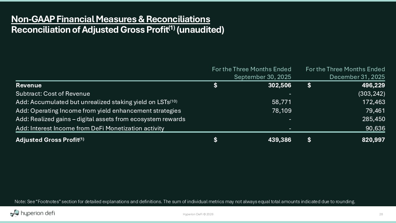 Hyperion DeFi © 2026 27 Disaggregated Non - GAAP Adjusted Gross Profit (1) *Only presented in the Company financials from activity on and after December 15, 2025. **The subset of realized and unrealized gains and losses derived from activities such as selling covered call options on HYPE to kens. ***The subset of realized gains - digital assets derived from ecosystem reward activity such as the receipt of airdrop KNTQ toke ns on November 27, 2025. ****The subset of interest income from digital assets receivables. Note: Adjusted Gross Profit is non - GAAP financial measure. See “Footnotes” and "Financial Supplement" sections for detailed defi nitions and reconciliations to the nearest GAAP Metric. FY'25 Q4'25 Q3'25 Q2'25 Q1'25 (Figures in $ thousands) 15 - - - 15 Life Sciences Revenue Revenue 414 133 281 - - HYPE Staking Yield - HYPD Tokens 296 296 - - - HYPE Staking Yield - 3rd Party Tokens* 70 49 21 - - Validator Commissions - HYPD Portion 7 7 - - - Validator Commissions - Non - HYPD Portion* 12 12 <1 - - DeFi Monetization Revenue (<1) - - - (<1) Life Sciences Cost of Revenue Cost of Revenue (296) (296) - - - HYPE Staking Yield Cost of Revenue - 3rd Party Tokens* (7) (7) - - - Validator Commissions Cost of Revenue - Non - HYPD Portion* 231 172 59 - - LST Staking Yield - HYPD Tokens (10) Non - GAAP Adjustments 158 79 78 - - Yield Enhancement** Operating Income 285 285 - - - Ecosystem Rewards*** 91 91 - - - DeFi Monetization Interest Income**** Other Income 1,275 821 439 - 15 Non - GAAP Adjusted Gross Profit (1)