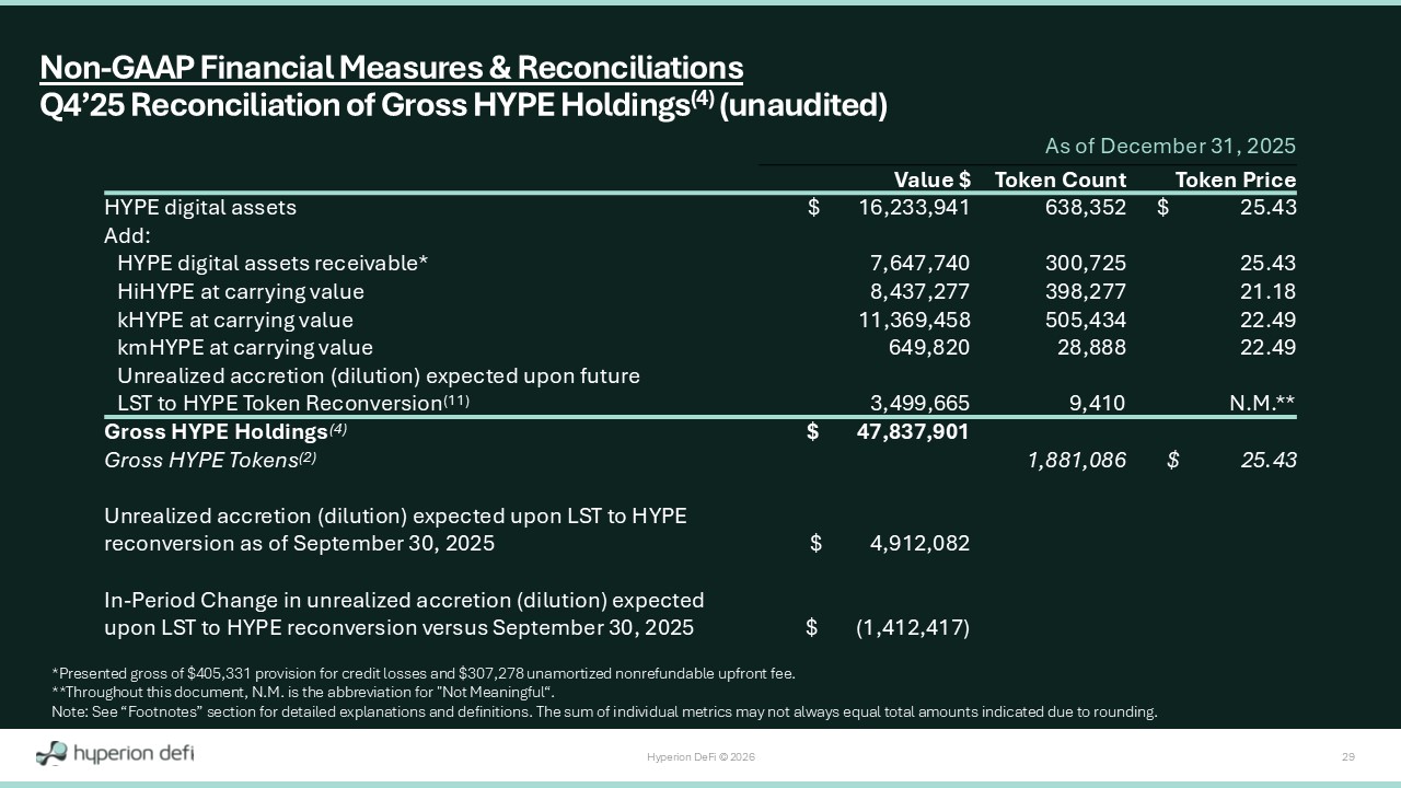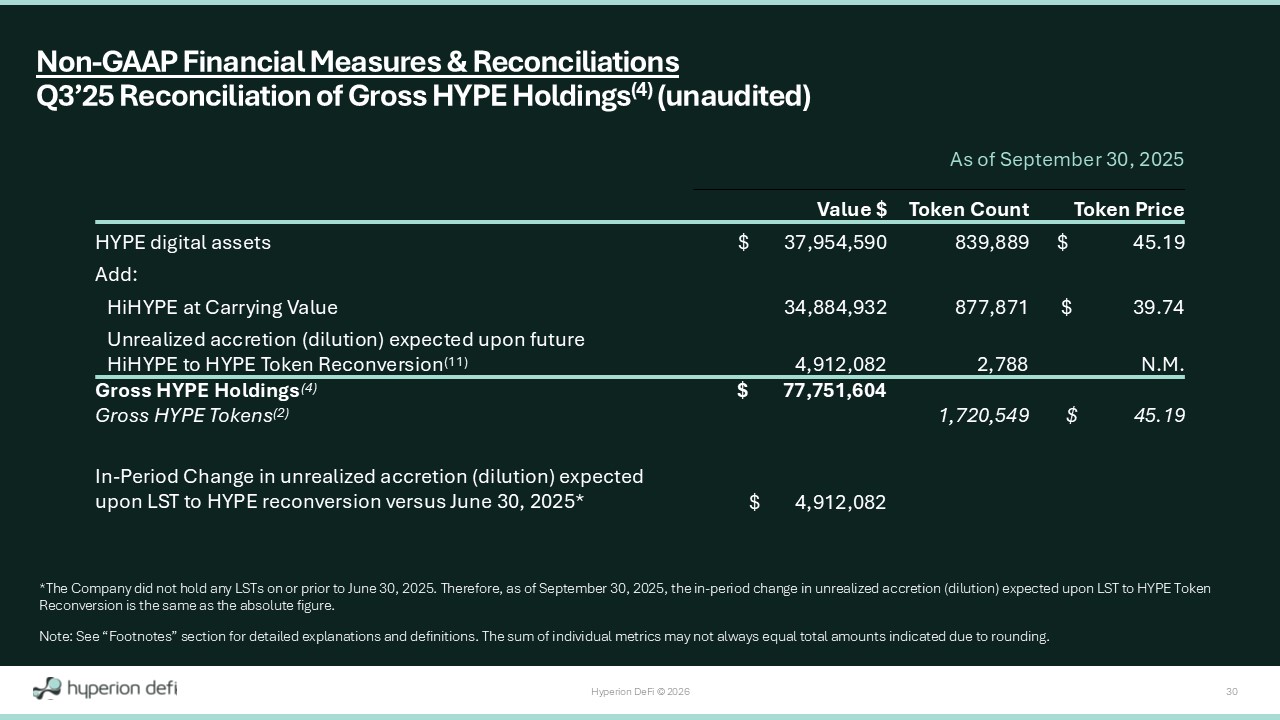 Hyperion DeFi © 2026 29 As of December 31, 2025 Token Price Token Count Value $ $ 25.43 638,352 $ 16,233,941 HYPE digital assets Add: 25.43 300,725 7,647,740 HYPE digital assets receivable* 21.18 398,277 8,437,277 HiHYPE at carrying value 22.49 505,434 11,369,458 kHYPE at carrying value 22.49 28,888 649,820 kmHYPE at carrying value N.M.** 9,410 3,499,665 Unrealized accretion (dilution) expected upon future LST to HYPE Token Reconversion (11) $ 47,837,901 Gross HYPE Holdings (4) $ 25.43 1,881,086 Gross HYPE Tokens (2) $ 4,912,082 Unrealized accretion (dilution) expected upon LST to HYPE reconversion as of September 30, 2025 $ (1,412,417) In - Period Change in unrealized accretion (dilution) expected upon LST to HYPE reconversion versus September 30, 2025 *Presented gross of $405,331 provision for credit losses and $307,278 unamortized nonrefundable upfront fee. **Throughout this document, N.M. is the abbreviation for "Not Meaningful“. Note: See “Footnotes” section for detailed explanations and definitions. The sum of individual metrics may not always equal t ota l amounts indicated due to rounding. Non - GAAP Financial Measures & Reconciliations Q4’25 Reconciliation of Gross HYPE Holdings (4) (unaudited)