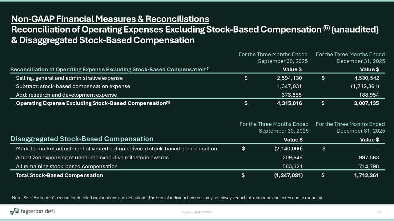 Hyperion DeFi © 2026 31 For the Three Months Ended December 31, 2025 For the Three Months Ended September 30, 2025 Reconciliation of Operating Expense Excluding Stock - Based Compensation (5) Value $ Value $ $ 4,530,542 $ 2,594,130 Selling, general and administrative expense (1,712,361) 1,347,031 Subtract: stock - based compensation expense 188,954 373,855 Add: research and development expense $ 3,007,135 $ 4,315,016 Operating Expense Excluding Stock - Based Compensation (5) Non - GAAP Financial Measures & Reconciliations Reconciliation of Operating Expenses Excluding Stock - Based Compensation (5) (unaudited) & Disaggregated Stock - Based Compensation Note: See “Footnotes” section for detailed explanations and definitions. The sum of individual metrics may not always equal t ota l amounts indicated due to rounding. For the Three Months Ended December 31, 2025 For the Three Months Ended September 30, 2025 Disaggregated Stock - Based Compensation Value $ Value $ $ - $ (2,140,000) Mark - to - market adjustment of vested but undelivered stock - based compensation 997,563 209,648 Amortized expensing of unearned executive milestone awards 714,798 583,321 All remaining stock - based compensation $ 1,712,361 $ (1,347,031) Total Stock - Based Compensation
