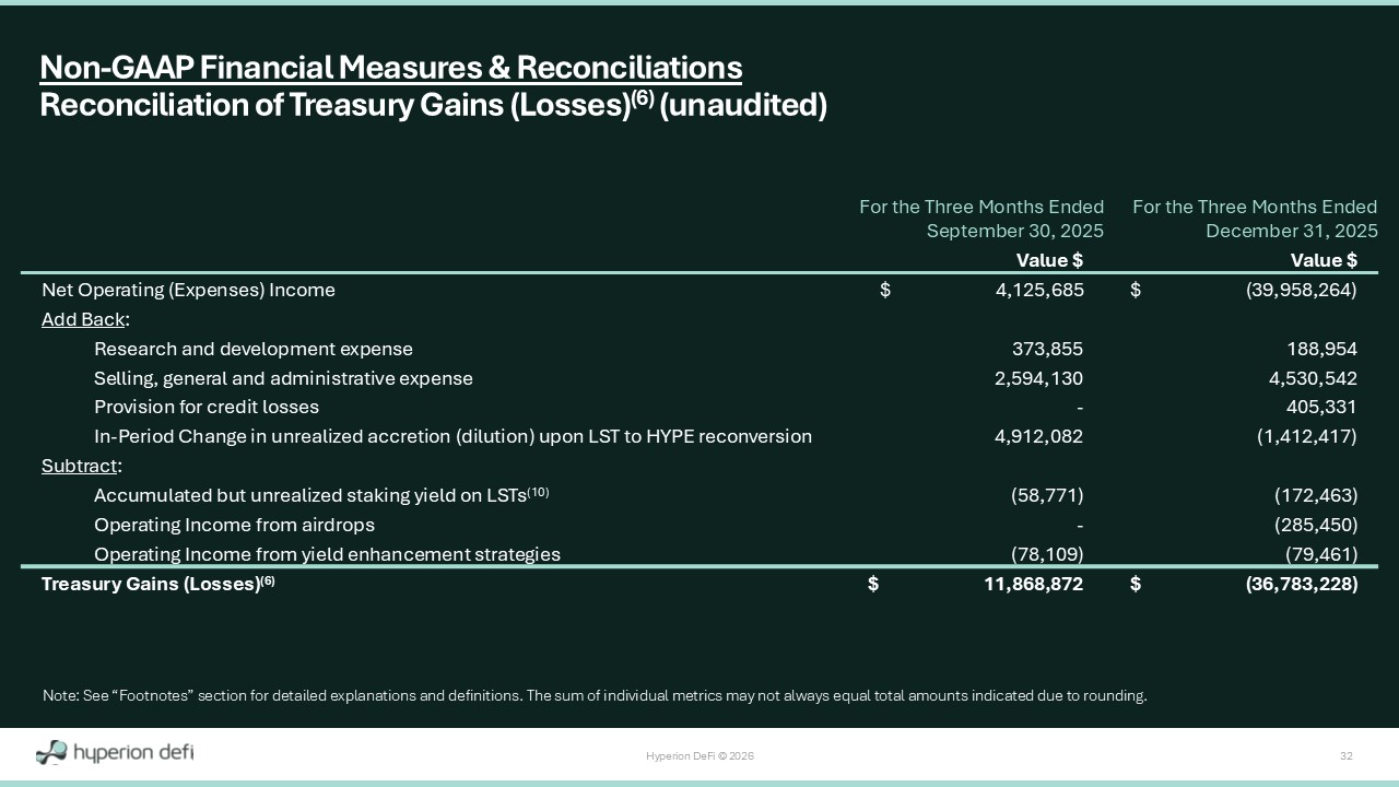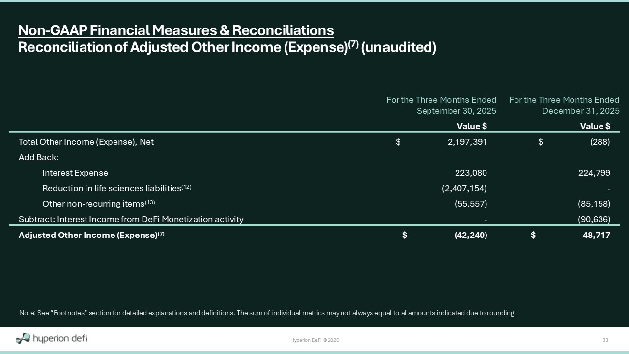 Hyperion DeFi © 2026 32 For the Three Months Ended December 31, 2025 For the Three Months Ended September 30, 2025 Value $ Value $ $ (39,958,264) $ 4,125,685 Net Operating (Expenses) Income Add Back : 188,954 373,855 Research and development expense 4,530,542 2,594,130 Selling, general and administrative expense 405,331 - Provision for credit losses (1,412,417) 4,912,082 In - Period Change in unrealized accretion (dilution) upon LST to HYPE reconversion Subtract : (172,463) (58,771) Accumulated but unrealized staking yield on LSTs (10) (285,450) - Operating Income from airdrops (79,461) (78,109) Operating Income from yield enhancement strategies $ (36,783,228) $ 11,868,872 Treasury Gains (Losses) (6) Non - GAAP Financial Measures & Reconciliations Reconciliation of Treasury Gains (Losses) (6) (unaudited) Note: See “Footnotes” section for detailed explanations and definitions. The sum of individual metrics may not always equal t ota l amounts indicated due to rounding.