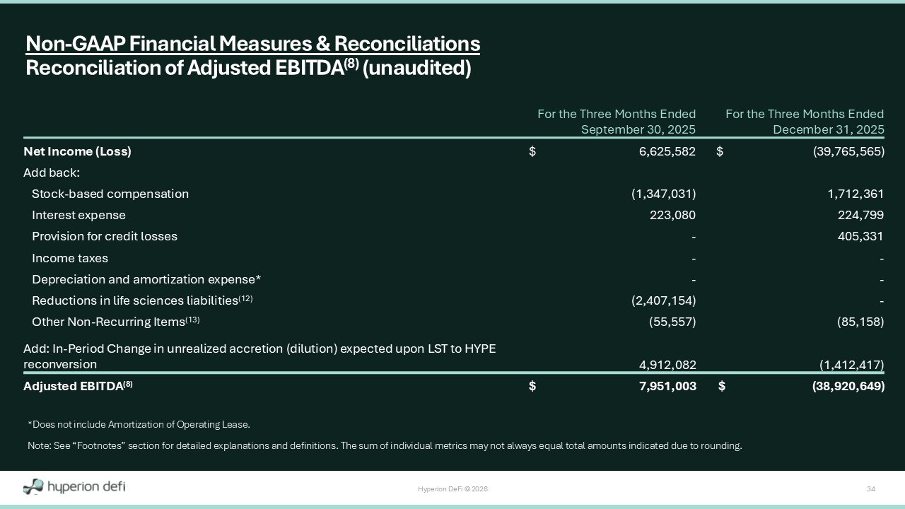 Hyperion DeFi © 2026 33 For the Three Months Ended December 31, 2025 For the Three Months Ended September 30, 2025 Value $ Value $ $ (288) $ 2,197,391 Total Other Income (Expense), Net Add Back : 224,799 223,080 Interest Expense - (2,407,154) Reduction in life sciences liabilities (12) (85,158) (55,557) Other non - recurring items (13) (90,636) - Subtract: Interest Income from DeFi Monetization activity $ 48,717 $ (42,240) Adjusted Other Income (Expense) (7) Non - GAAP Financial Measures & Reconciliations Reconciliation of Adjusted Other Income (Expense) (7) (unaudited) Note: See “Footnotes” section for detailed explanations and definitions. The sum of individual metrics may not always equal t ota l amounts indicated due to rounding.