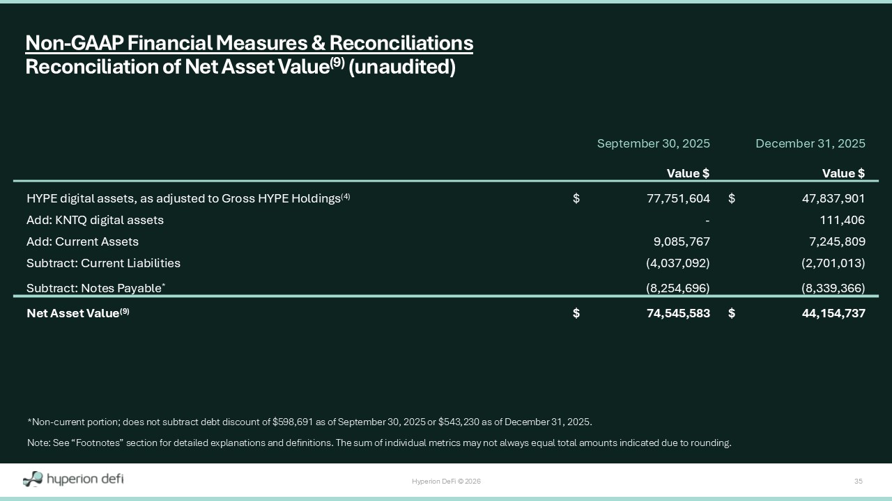 Hyperion DeFi © 2026 34 For the Three Months Ended December 31, 2025 For the Three Months Ended September 30, 2025 $ (39,765,565) $ 6,625,582 Net Income (Loss) Add back: 1,712,361 (1,347,031) Stock - based compensation 224,799 223,080 Interest expense 405,331 - Provision for credit losses - - Income taxes - - Depreciation and amortization expense* - (2,407,154) Reductions in life sciences liabilities (12) (85,158) (55,557) Other Non - Recurring Items (13) (1,412,417) 4,912,082 Add: In - Period Change in unrealized accretion (dilution) expected upon LST to HYPE reconversion $ (38,920,649) $ 7,951,003 Adjusted EBITDA (8) Non - GAAP Financial Measures & Reconciliations Reconciliation of Adjusted EBITDA (8) (unaudited) *Does not include Amortization of Operating Lease. Note: See “Footnotes” section for detailed explanations and definitions. The sum of individual metrics may not always equal t ota l amounts indicated due to rounding.