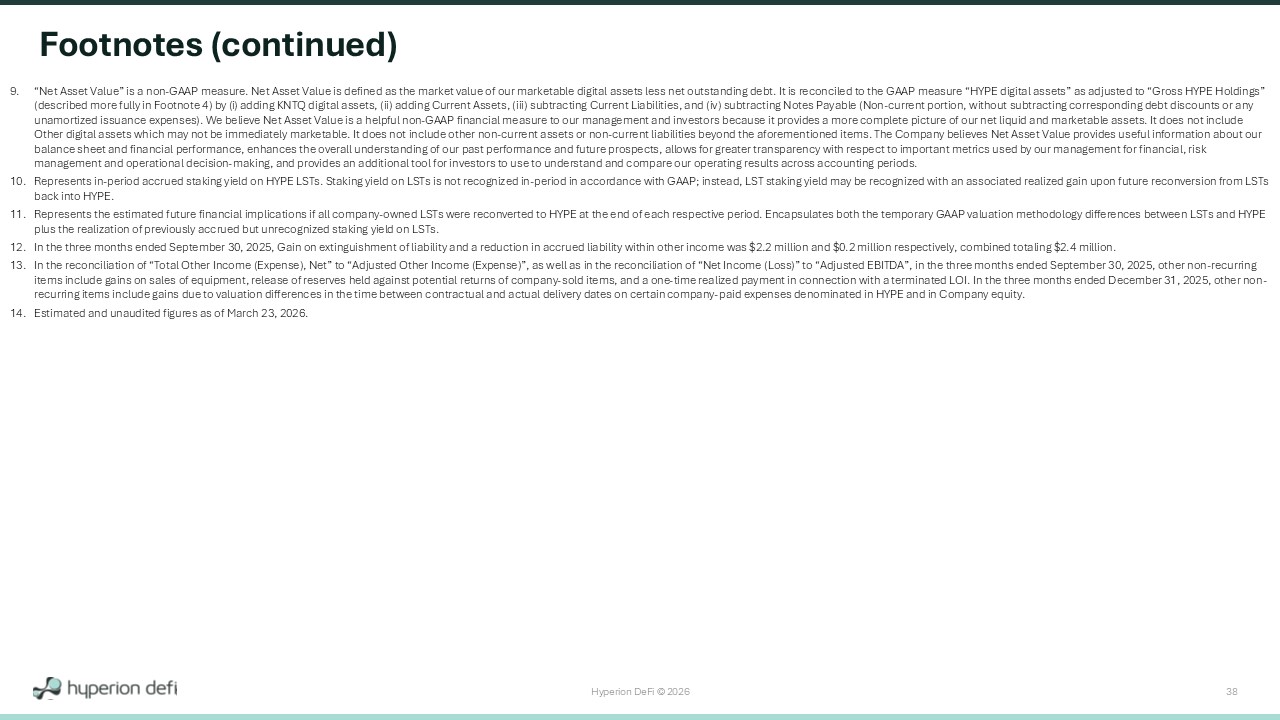 Hyperion DeFi © 2026 38 Footnotes (continued) 9. “Net Asset Value” is a non - GAAP measure. Net Asset Value is defined as the market value of our marketable digital assets less ne t outstanding debt. It is reconciled to the GAAP measure “HYPE digital assets” as adjusted to “Gross HYPE Holdings” (described more fully in Footnote 4) by ( i ) adding KNTQ digital assets, (ii) adding Current Assets, (iii) subtracting Current Liabilities, and (iv) subtracting Notes P aya ble (Non - current portion, without subtracting corresponding debt discounts or any unamortized issuance expenses). We believe Net Asset Value is a helpful non - GAAP financial measure to our management and investo rs because it provides a more complete picture of our net liquid and marketable assets. It does not include Other digital assets which may not be immediately marketable. It does not include other non - current assets or non - current liabil ities beyond the aforementioned items. The Company believes Net Asset Value provides useful information about our balance sheet and financial performance, enhances the overall understanding of our past performance and future prospects, all ows for greater transparency with respect to important metrics used by our management for financial, risk management and operational decision - making, and provides an additional tool for investors to use to understand and compare our o perating results across accounting periods. 10. Represents in - period accrued staking yield on HYPE LSTs. Staking yield on LSTs is not recognized in - period in accordance with GA AP; instead, LST staking yield may be recognized with an associated realized gain upon future reconversion from LSTs back into HYPE. 11. Represents the estimated future financial implications if all company - owned LSTs were reconverted to HYPE at the end of each res pective period. Encapsulates both the temporary GAAP valuation methodology differences between LSTs and HYPE plus the realization of previously accrued but unrecognized staking yield on LSTs. 12. In the three months ended September 30, 2025, Gain on extinguishment of liability and a reduction in accrued liability within ot her income was $2.2 million and $0.2 million respectively, combined totaling $2.4 million. 13. In the reconciliation of “Total Other Income (Expense), Net” to “Adjusted Other Income (Expense)”, as well as in the reconcil iat ion of “Net Income (Loss)” to “Adjusted EBITDA”, in the three months ended September 30, 2025, other non - recurring items include gains on sales of equipment, release of reserves held against potential returns of company - sold items, and a one - t ime realized payment in connection with a terminated LOI. In the three months ended December 31, 2025, other non - recurring items include gains due to valuation differences in the time between contractual and actual delivery dates on certa in company - paid expenses denominated in HYPE and in Company equity. 14. Estimated and unaudited figures as of March 23, 2026.