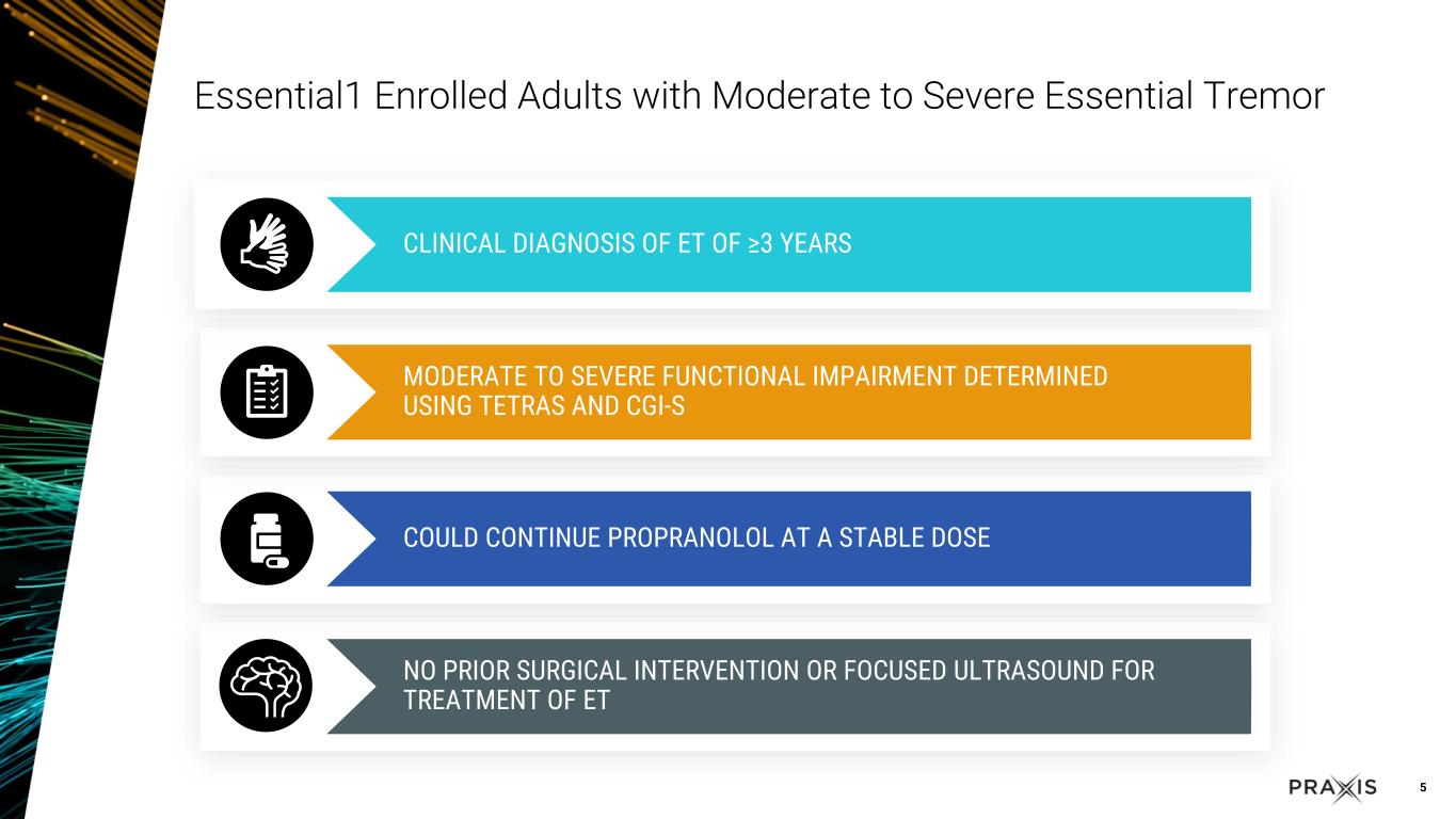 4 Topline Analysis: Essential1 Endpoints Measure Function and Quality of Life Improvements that Matter Most to Patients ADL = activities of daily living; AE = adverse event; CUL = combined upper limb; PS = performance subscale; TETRAS = TRG Essential Tremor Rating Assessment Scale; UL = upper limb. • Change from baseline to Day 56 on the TETRAS modified Activities of Daily Living (mADL) • Incidence and severity of AEs, including discontinuation of study drug due to AEs • Clinical Global Impression-Severity (CGI-S) • Patient Global Impression-Change (PGI-C) • TETRAS-ADL total score, TETRAS-UL score, TETRAS-CUL score, TETRAS-PS score SECONDARY ENDPOINTS PRIMARY ENDPOINT • Modified Activities of Daily Living score excluding the TETRAS-PS (mADL excluding PS) POST-HOC ANALYSES