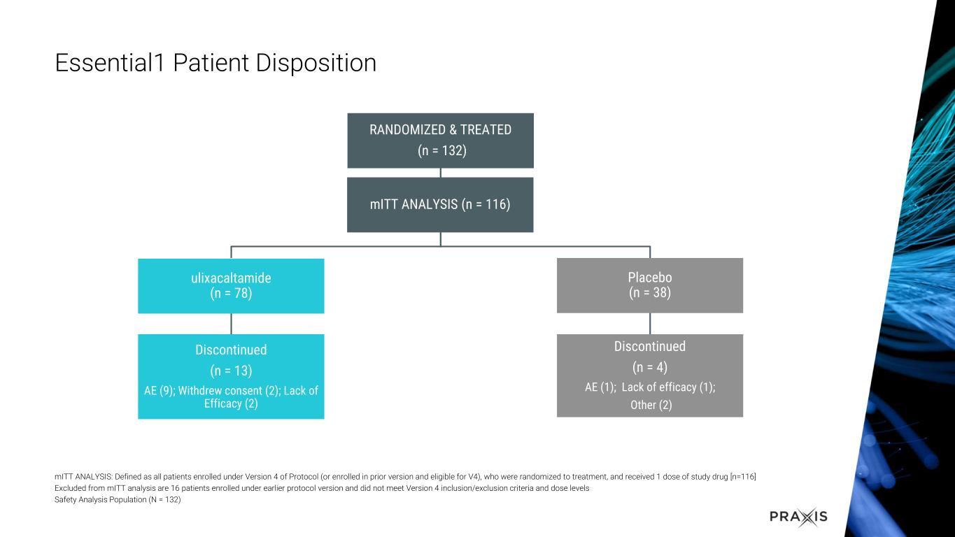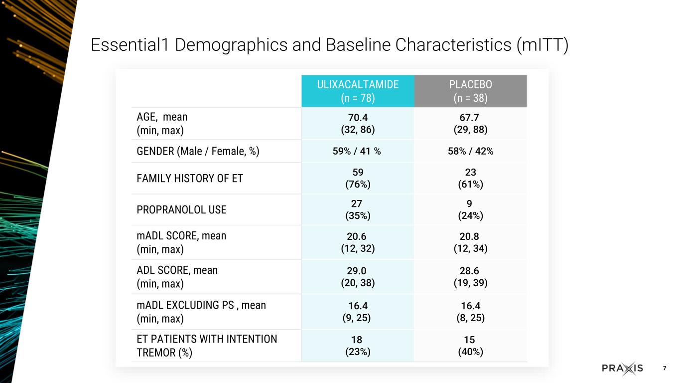 6 Discontinued (n = 13) AE (9); Withdrew consent (2); Lack of Efficacy (2) Essential1 Patient Disposition RANDOMIZED & TREATED (n = 132) ulixacaltamide (n = 78) Placebo (n = 38) Discontinued (n = 4) AE (1); Lack of efficacy (1); Other (2) mITT ANALYSIS (n = 116) mITT ANALYSIS: Defined as all patients enrolled under Version 4 of Protocol (or enrolled in prior version and eligible for V4), who were randomized to treatment, and received 1 dose of study drug [n=116] Excluded from mITT analysis are 16 patients enrolled under earlier protocol version and did not meet Version 4 inclusion/exclusion criteria and dose levels Safety Analysis Population (N = 132)