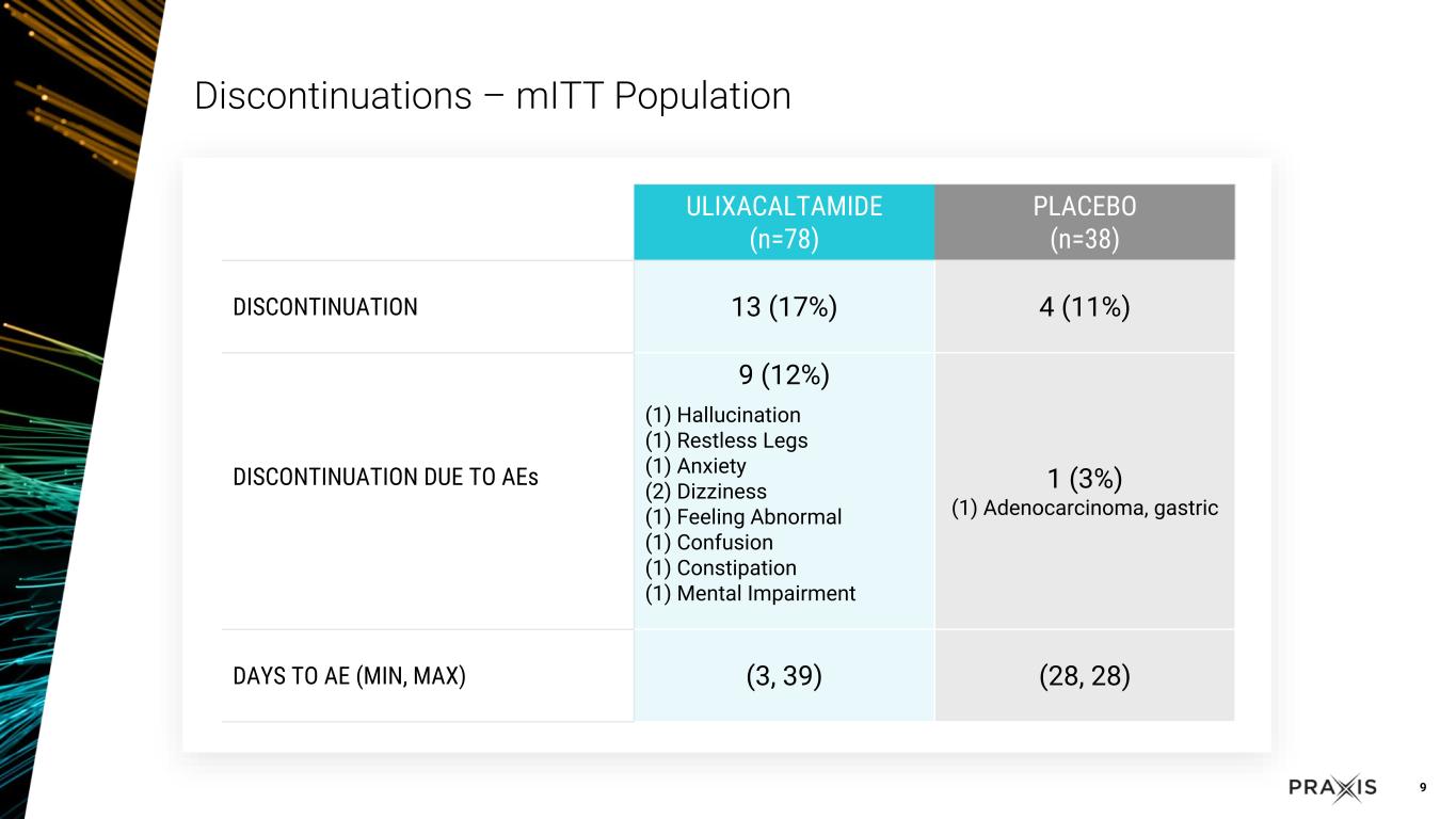 8 Ulixacaltamide was Generally Well-tolerated *3 SAEs in 2 subjects, all deemed unrelated to treatment (exacerbation of COPD in 1 patient; esophageal obstruction & gastric adenocarcinoma in 1 patient) ULIXACALTAMIDE (n=91) PLACEBO (n=41) ANY TEAE 70 (76.9%) 21 (51.2%) TEAEs > 5% DIZZINESS 13 (14.3%) 2 (4.9%) CONSTIPATION 9 (9.9%) 0 HEADACHE 8 (8.8%) 1 (2.4%) FATIGUE 8 (8.8%) 1 (2.4%) ANXIETY 6 (6.6%) 0 FEELING ABNORMAL 6 (6.6%) 0 PARAESTHESIA 6 (6.6%) 0 No clear dose response relationship for TEAEs AEs were generally mild to moderate No drug related SAEs*