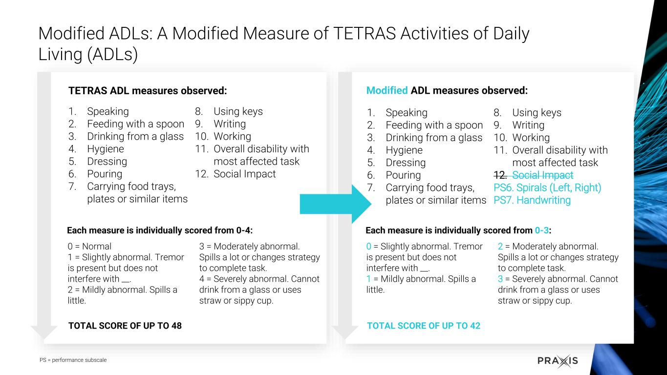 12 Modified ADLs: A Modified Measure of TETRAS Activities of Daily Living (ADLs) 1. Speaking 2. Feeding with a spoon 3. Drinking from a glass 4. Hygiene 5. Dressing 6. Pouring 7. Carrying food trays, plates or similar items 8. Using keys 9. Writing 10. Working 11. Overall disability with most affected task 12. Social Impact TETRAS ADL measures observed: 0 = Normal 1 = Slightly abnormal. Tremor is present but does not interfere with __. 2 = Mildly abnormal. Spills a little. 3 = Moderately abnormal. Spills a lot or changes strategy to complete task. 4 = Severely abnormal. Cannot drink from a glass or uses straw or sippy cup. Each measure is individually scored from 0-4: TOTAL SCORE OF UP TO 48 1. Speaking 2. Feeding with a spoon 3. Drinking from a glass 4. Hygiene 5. Dressing 6. Pouring 7. Carrying food trays, plates or similar items 8. Using keys 9. Writing 10. Working 11. Overall disability with most affected task 12. Social Impact PS6. Spirals (Left, Right) PS7. Handwriting 0 = Slightly abnormal. Tremor is present but does not interfere with __. 1 = Mildly abnormal. Spills a little. 2 = Moderately abnormal. Spills a lot or changes strategy to complete task. 3 = Severely abnormal. Cannot drink from a glass or uses straw or sippy cup. Each measure is individually scored from 0-3: TOTAL SCORE OF UP TO 42 Modified ADL measures observed: PS = performance subscale
