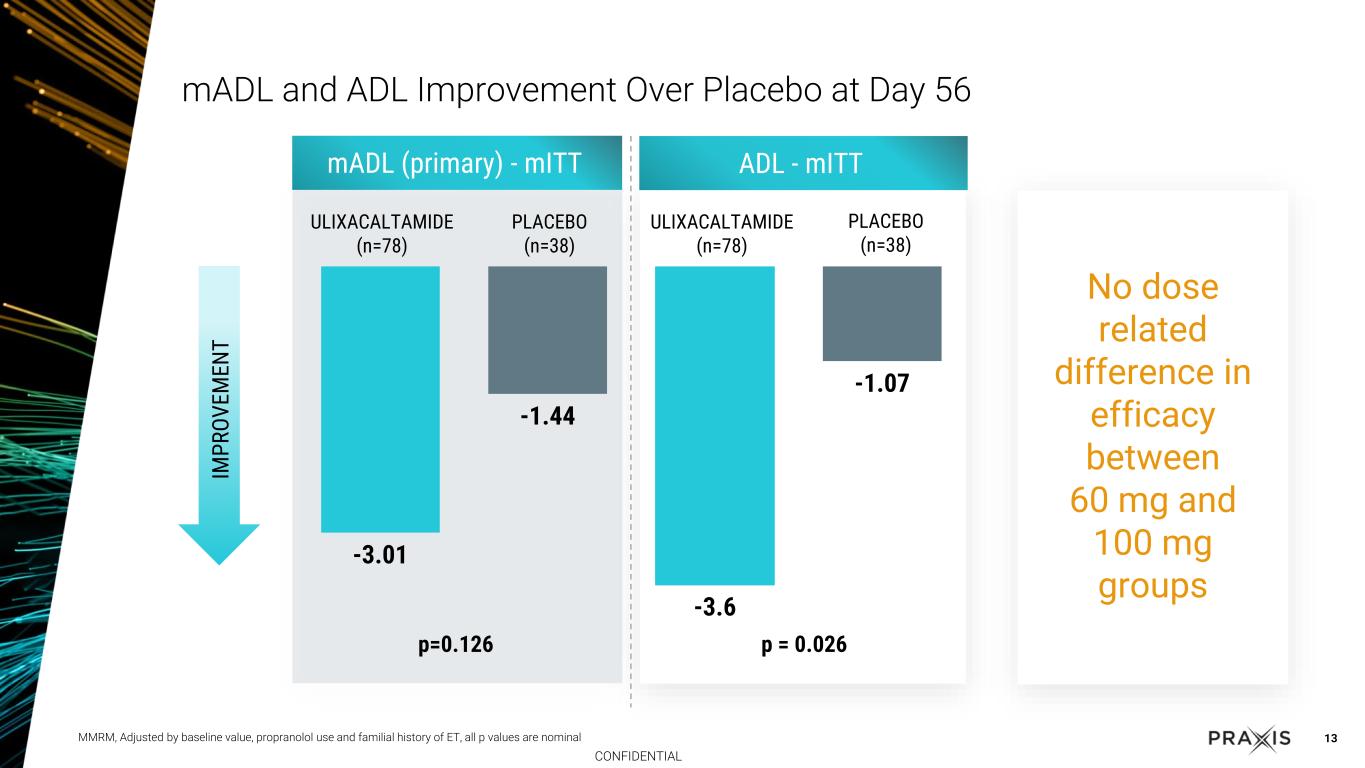 13 mADL and ADL Improvement Over Placebo at Day 56 -3.01 -1.44 -3.6 -1.07 IM PR OV EM EN T No dose related difference in efficacy between 60 mg and 100 mg groups p=0.126 ULIXACALTAMIDE (n=78) ULIXACALTAMIDE (n=78) PLACEBO (n=38) PLACEBO (n=38) MMRM, Adjusted by baseline value, propranolol use and familial history of ET, all p values are nominal p = 0.026 mADL (primary) - mITT ADL - mITT CONFIDENTIAL