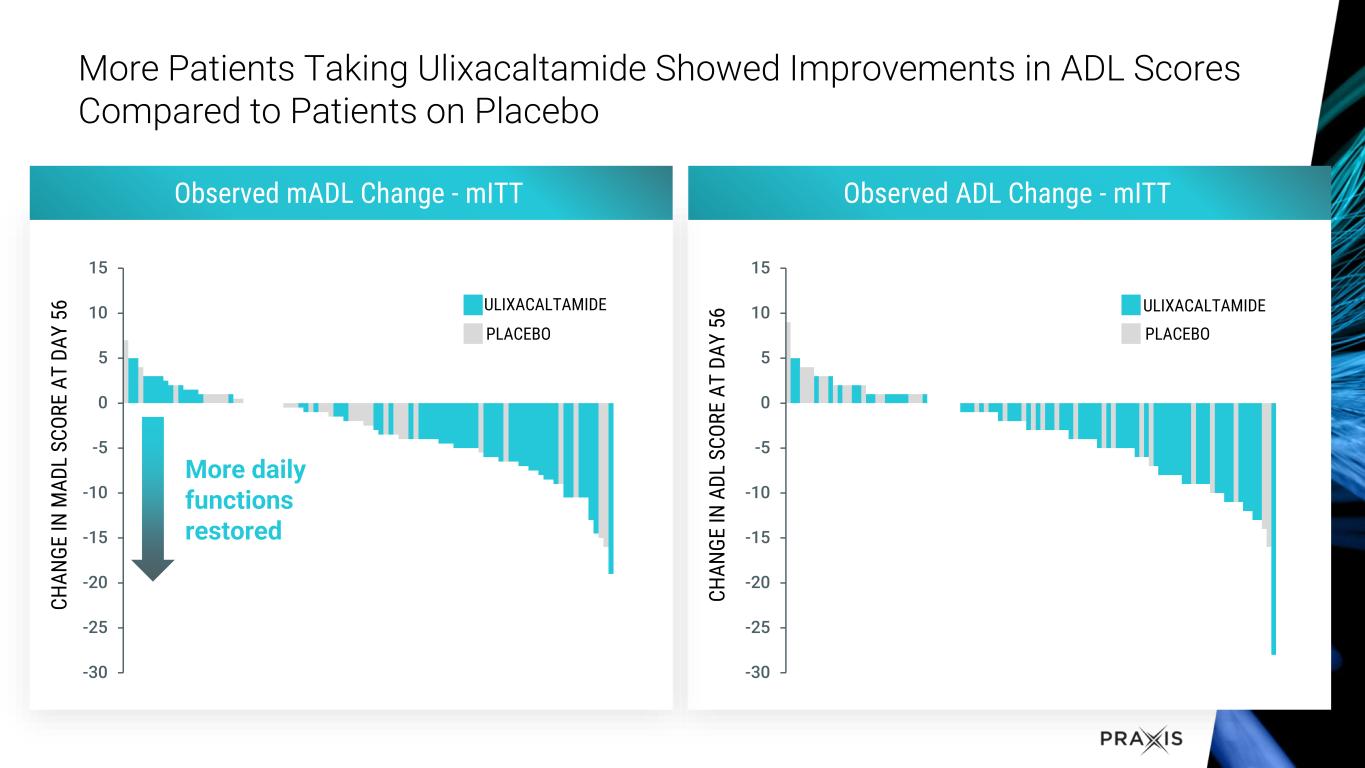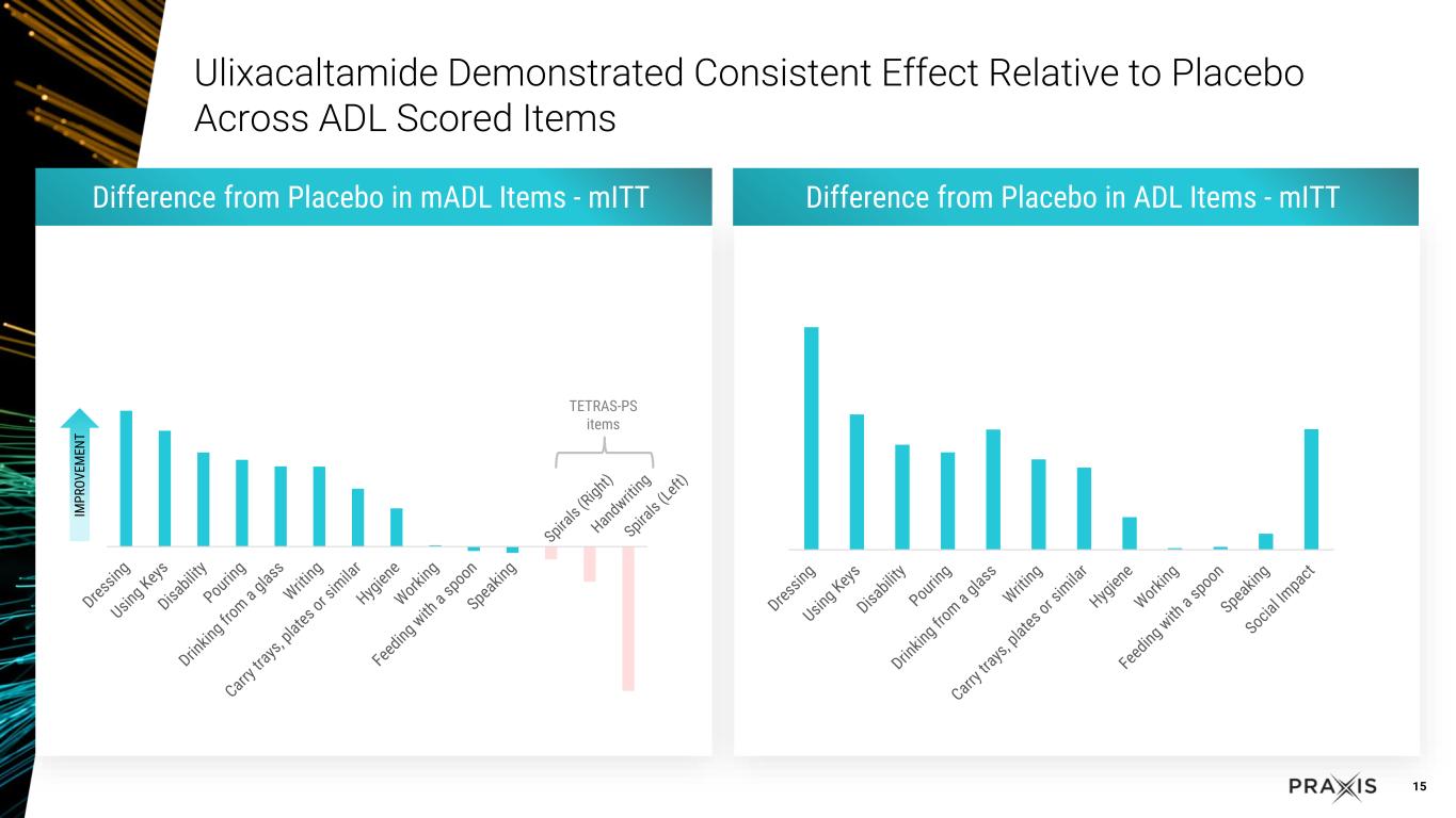 14 -30 -25 -20 -15 -10 -5 0 5 10 15 More Patients Taking Ulixacaltamide Showed Improvements in ADL Scores Compared to Patients on Placebo Observed ADL Change - mITTObserved mADL Change - mITT -30 -25 -20 -15 -10 -5 0 5 10 15 CH AN GE IN M AD L SC OR E AT D AY 5 6 More daily functions restored ULIXACALTAMIDE PLACEBO CH AN GE IN A DL S CO RE A T DA Y 56 ULIXACALTAMIDE PLACEBO