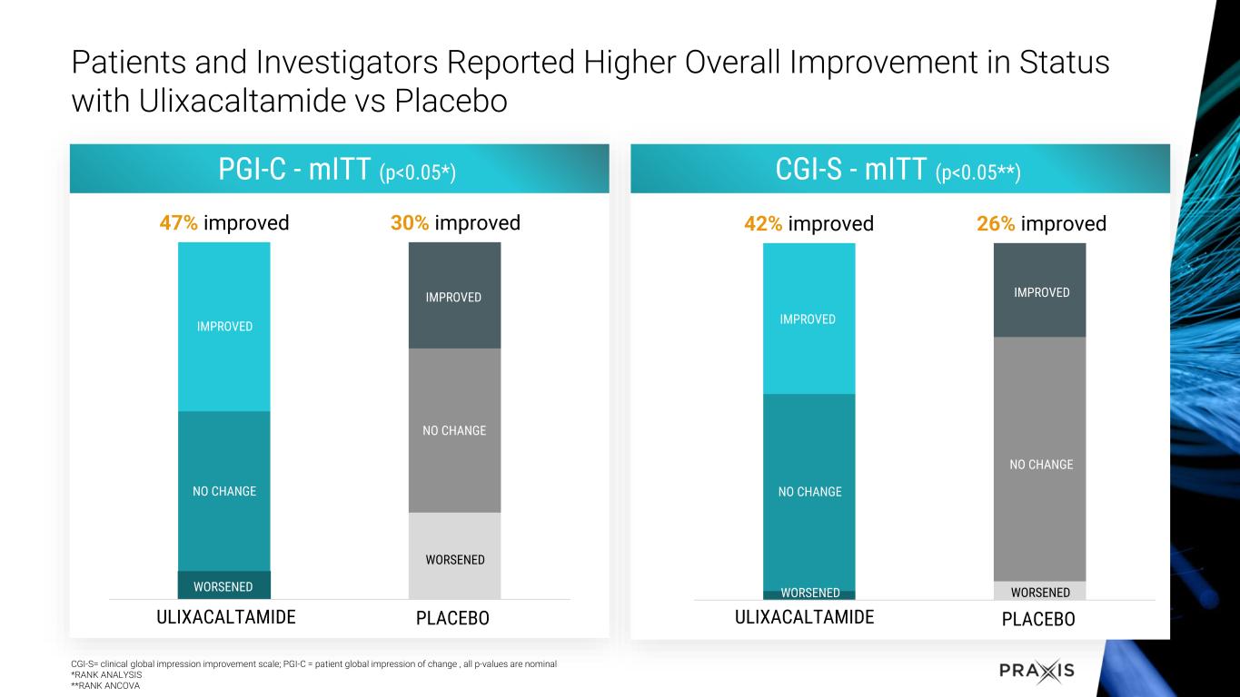 16 Patients and Investigators Reported Higher Overall Improvement in Status with Ulixacaltamide vs Placebo CGI-S= clinical global impression improvement scale; PGI-C = patient global impression of change , all p-values are nominal *RANK ANALYSIS **RANK ANCOVA NO CHANGE IMPROVED NO CHANGE IMPROVED WORSENED NO CHANGE WORSENED NO CHANGE WORSENED 47% improved 30% improved 42% improved 26% improved IMPROVED IMPROVED PGI-C - mITT (p<0.05*) CGI-S - mITT (p<0.05**) ULIXACALTAMIDE PLACEBO ULIXACALTAMIDE PLACEBO WORSENED
