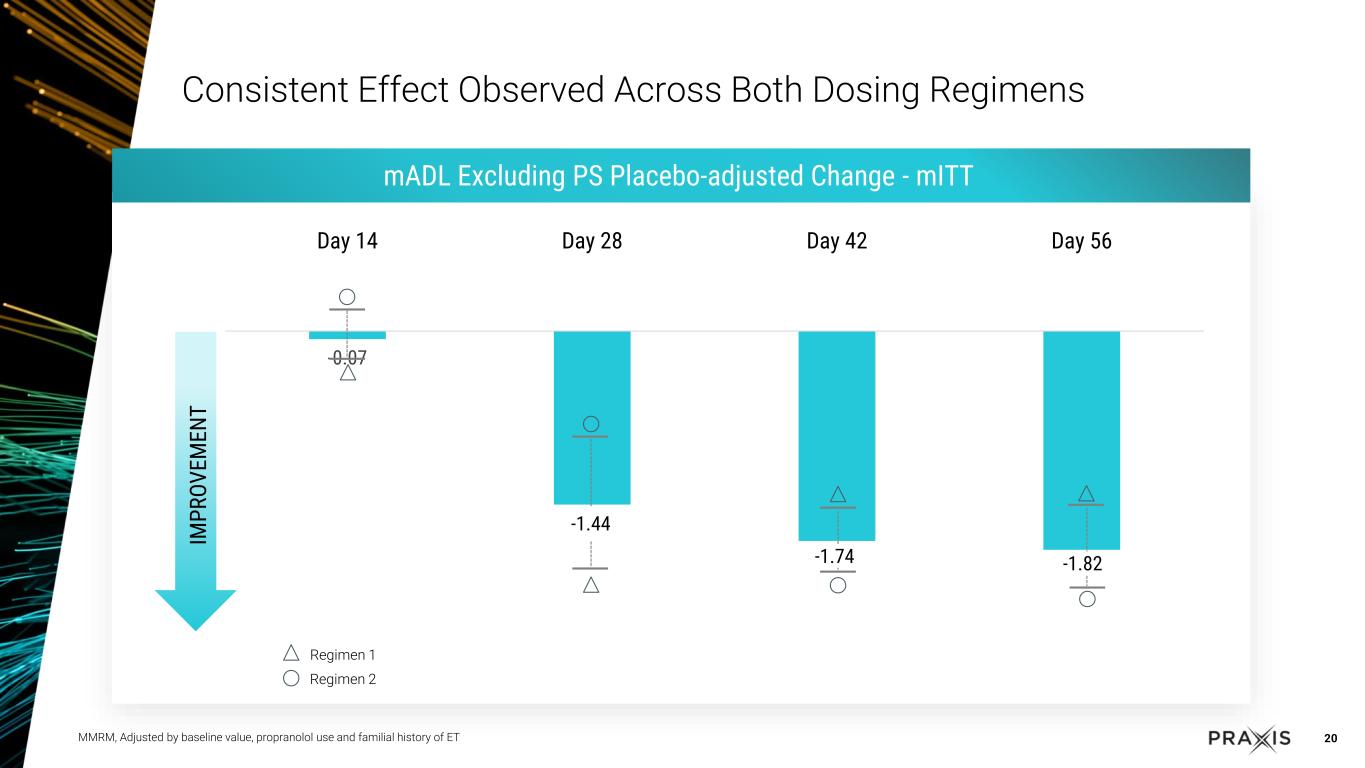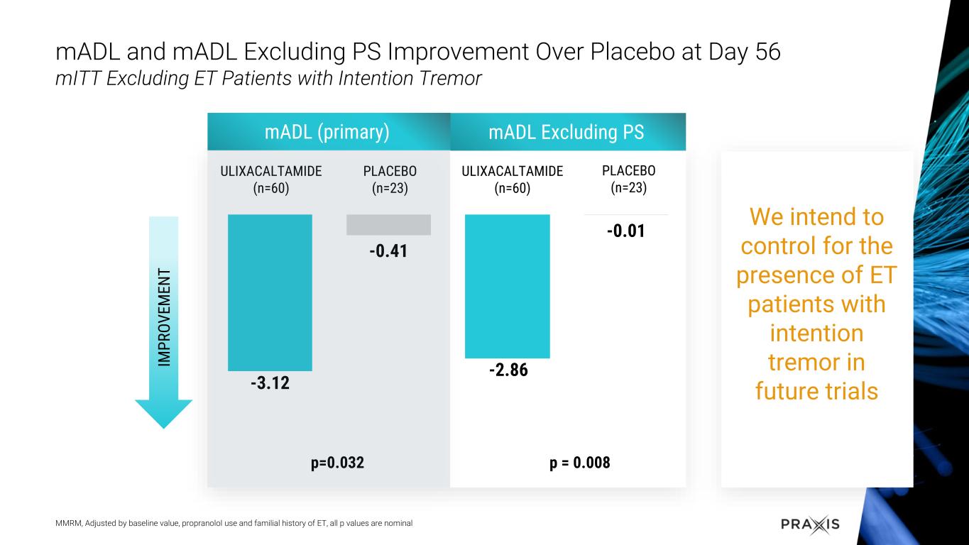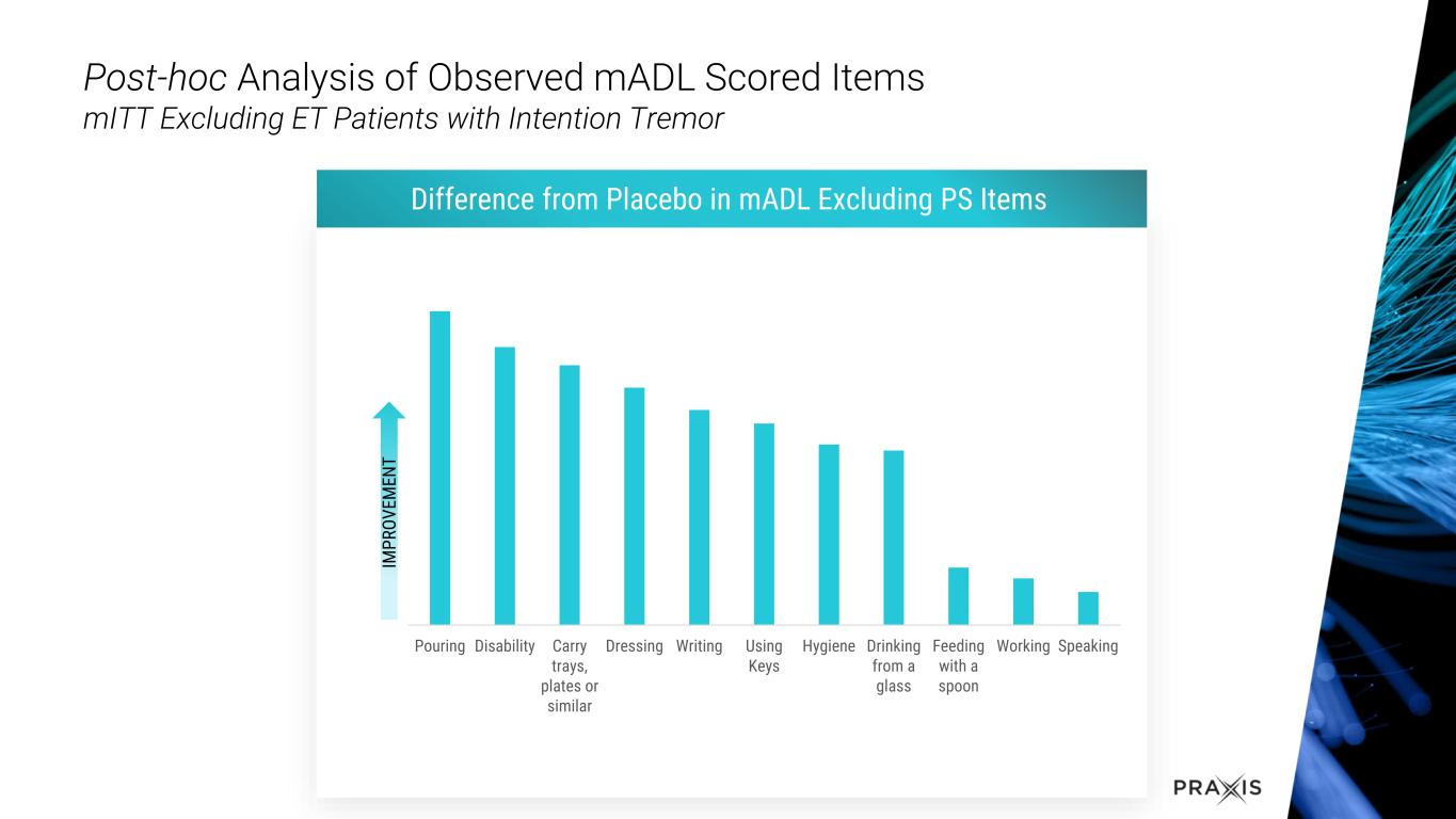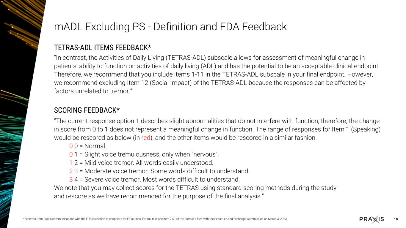 18 TETRAS-ADL ITEMS FEEDBACK* “In contrast, the Activities of Daily Living (TETRAS-ADL) subscale allows for assessment of meaningful change in patients’ ability to function on activities of daily living (ADL) and has the potential to be an acceptable clinical endpoint. Therefore, we recommend that you include items 1-11 in the TETRAS-ADL subscale in your final endpoint. However, we recommend excluding Item 12 (Social Impact) of the TETRAS-ADL because the responses can be affected by factors unrelated to tremor.” SCORING FEEDBACK* “The current response option 1 describes slight abnormalities that do not interfere with function; therefore, the change in score from 0 to 1 does not represent a meaningful change in function. The range of responses for Item 1 (Speaking) would be rescored as below (in red), and the other items would be rescored in a similar fashion. 0 0 = Normal. 0 1 = Slight voice tremulousness, only when "nervous". 1 2 = Mild voice tremor. All words easily understood. 2 3 = Moderate voice tremor. Some words difficult to understand. 3 4 = Severe voice tremor. Most words difficult to understand. We note that you may collect scores for the TETRAS using standard scoring methods during the study and rescore as we have recommended for the purpose of the final analysis.” mADL Excluding PS - Definition and FDA Feedback *Excerpts from Praxis communications with the FDA in relation to endpoints for ET studies. For full text, see item 7.01 of the Form 8-k filed with the Securities and Exchange Commission on March 3, 2023.