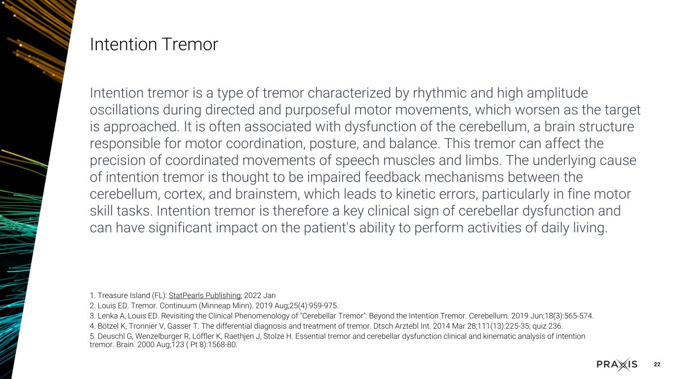 22 Intention tremor is a type of tremor characterized by rhythmic and high amplitude oscillations during directed and purposeful motor movements, which worsen as the target is approached. It is often associated with dysfunction of the cerebellum, a brain structure responsible for motor coordination, posture, and balance. This tremor can affect the precision of coordinated movements of speech muscles and limbs. The underlying cause of intention tremor is thought to be impaired feedback mechanisms between the cerebellum, cortex, and brainstem, which leads to kinetic errors, particularly in fine motor skill tasks. Intention tremor is therefore a key clinical sign of cerebellar dysfunction and can have significant impact on the patient's ability to perform activities of daily living. Intention Tremor 1. Treasure Island (FL): StatPearls Publishing; 2022 Jan 2. Louis ED. Tremor. Continuum (Minneap Minn). 2019 Aug;25(4):959-975. 3. Lenka A, Louis ED. Revisiting the Clinical Phenomenology of "Cerebellar Tremor": Beyond the Intention Tremor. Cerebellum. 2019 Jun;18(3):565-574. 4. Bötzel K, Tronnier V, Gasser T. The differential diagnosis and treatment of tremor. Dtsch Arztebl Int. 2014 Mar 28;111(13):225-35; quiz 236. 5. Deuschl G, Wenzelburger R, Löffler K, Raethjen J, Stolze H. Essential tremor and cerebellar dysfunction clinical and kinematic analysis of intention tremor. Brain. 2000 Aug;123 ( Pt 8):1568-80.