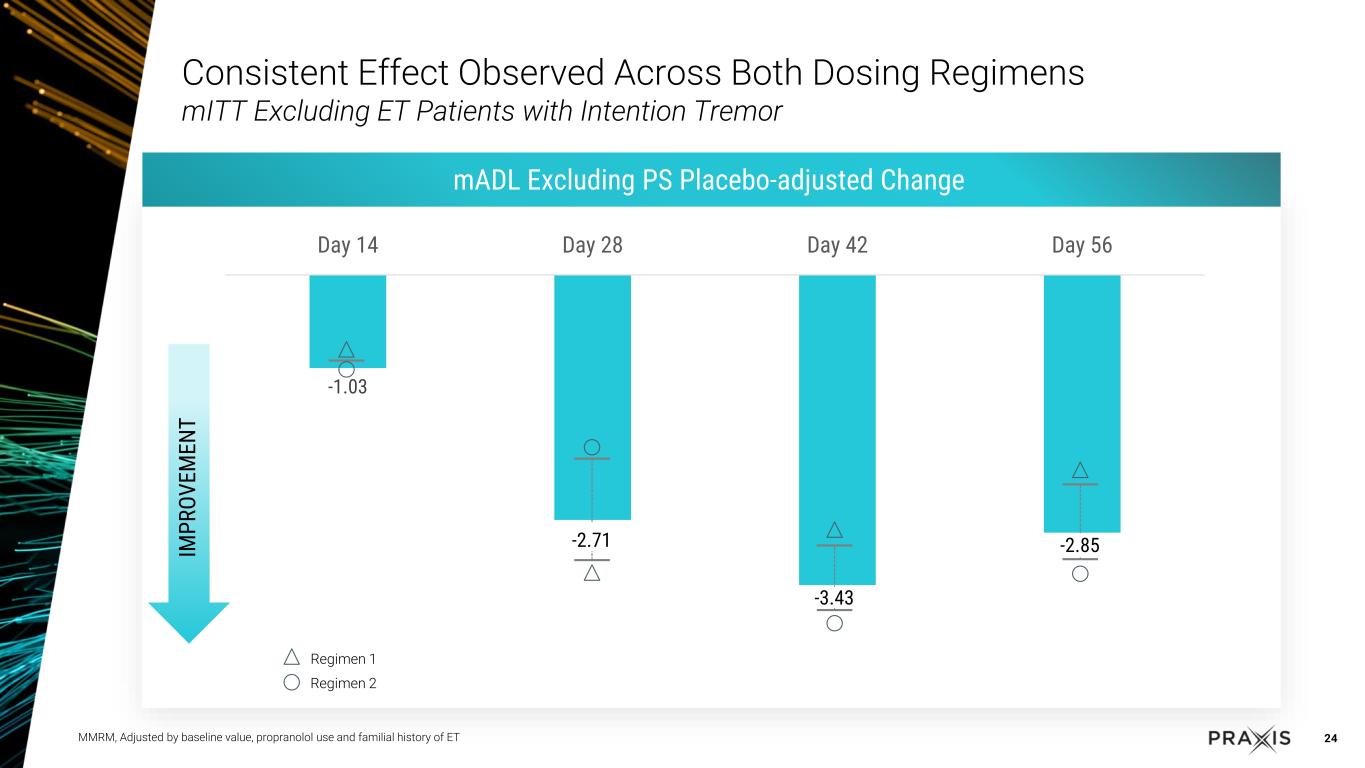 23 mADL and mADL Excluding PS Improvement Over Placebo at Day 56 mITT Excluding ET Patients with Intention Tremor MMRM, Adjusted by baseline value, propranolol use and familial history of ET, all p values are nominal -3.12 -0.41 -2.86 -0.01 IM PR OV EM EN T p=0.032 ULIXACALTAMIDE (n=60) ULIXACALTAMIDE (n=60) PLACEBO (n=23) PLACEBO (n=23) p = 0.008 mADL (primary) mADL Excluding PS We intend to control for the presence of ET patients with intention tremor in future trials