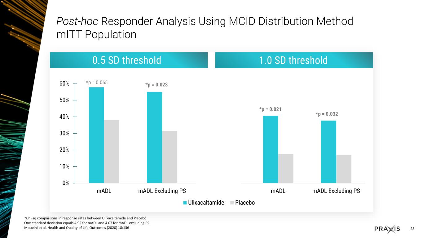 28 0.5 SD threshold 1.0 SD threshold Post-hoc Responder Analysis Using MCID Distribution Method mITT Population *Chi-sq comparisons in response rates between Ulixacaltamide and Placebo One standard deviation equals 4.92 for mADL and 4.07 for mADL excluding PS Mouelhi et al. Health and Quality of Life Outcomes (2020) 18:136 0% 10% 20% 30% 40% 50% 60% mADL mADL Excluding PS mADL mADL Excluding PS Ulixacaltamide Placebo *p = 0.065 *p = 0.023 *p = 0.021 *p = 0.032