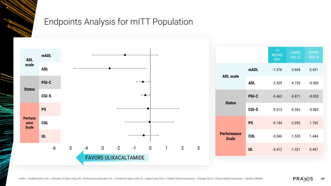 29 LS MEANS DIFF LOWER 95% CI UPPER 95% CI ADL scale mADL -1.576 -3.604 0.451 ADL -2.529 -4.753 -0.305 Status PGI-C -0.462 -0.871 -0.053 CGI-S -0.313 -0.562 -0.063 Performance Scale PS -0.144 -2.053 1.765 CUL -0.046 -1.535 1.444 UL -0.412 -1.321 0.497 Endpoints Analysis for mITT Population mADL = modified ADLs; ADL = Activities of Daily Living; PS = Performance Subscale; CUL = Combined Upper Limb; UL = Upper Limb, PGI-C = Patient Global Impression – Change; CGI-S = Clinical Global Impression – Severity, MMRM FAVORS ULIXACALTAMIDE ADL scale mADL ADL Status PGI-C CGI-S Perform ance Scale PS CUL UL -6 -5 -4 -3 -2 -1 0 1 2 3
