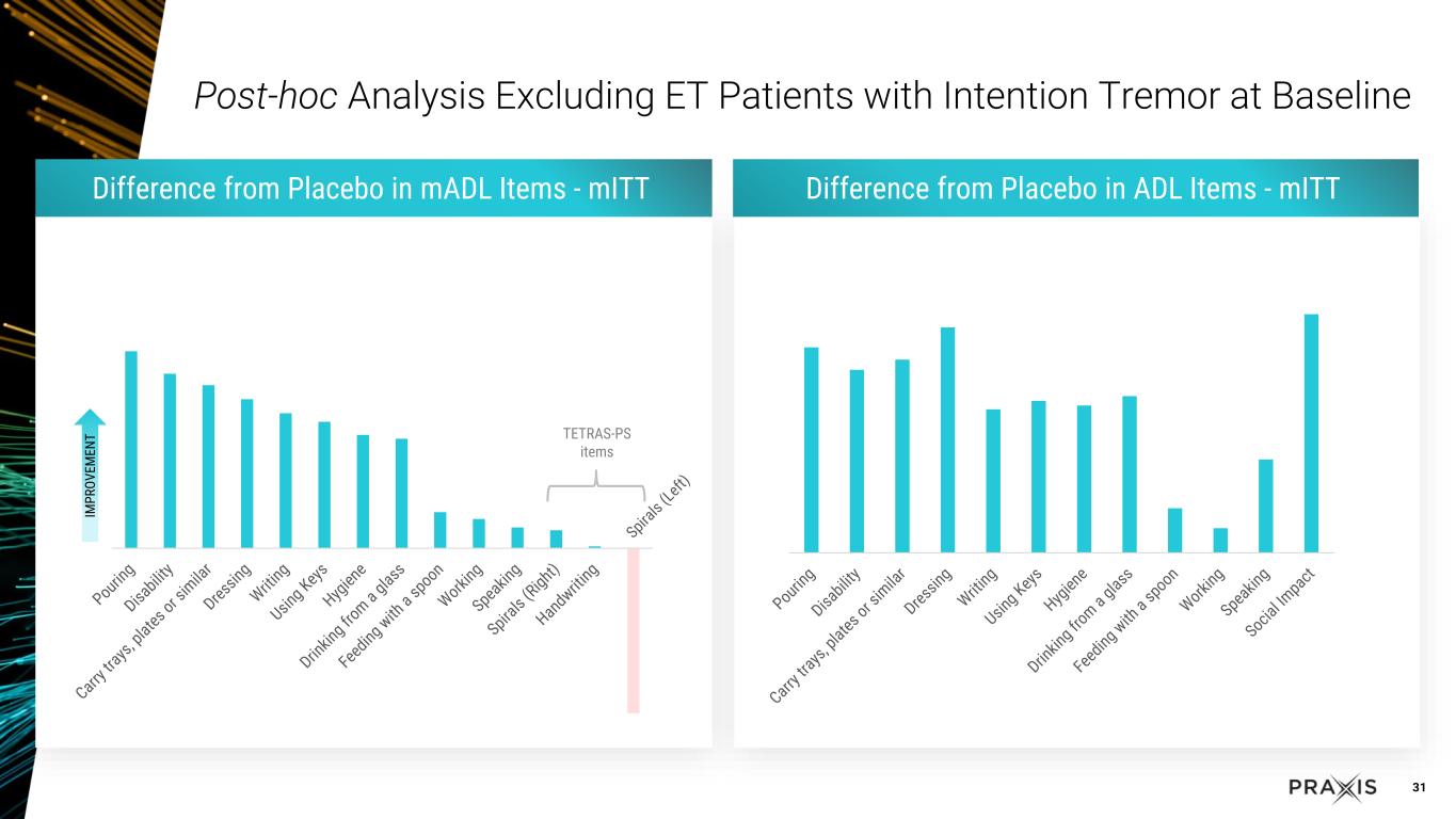 31 Post-hoc Analysis Excluding ET Patients with Intention Tremor at Baseline Difference from Placebo in ADL Items - mITTDifference from Placebo in mADL Items - mITT IM PR OV EM EN T TETRAS-PS items