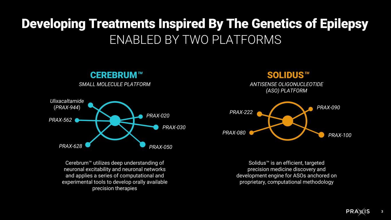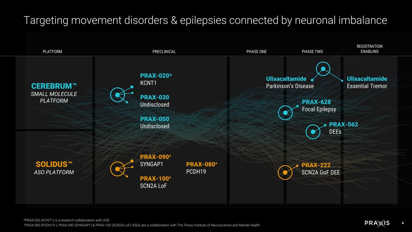 3 Developing Treatments Inspired By The Genetics of Epilepsy ENABLED BY TWO PLATFORMS CEREBRUM™ SMALL MOLECULE PLATFORM Cerebrum™ utilizes deep understanding of neuronal excitability and neuronal networks and applies a series of computational and experimental tools to develop orally available precision therapies PRAX-628 Ulixacaltamide (PRAX-944) PRAX-562 PRAX-020 PRAX-030 PRAX-050 SOLIDUS™ ANTISENSE OLIGONUCLEOTIDE (ASO) PLATFORM PRAX-090 PRAX-222 PRAX-080 PRAX-100 Solidus™ is an efficient, targeted precision medicine discovery and development engine for ASOs anchored on proprietary, computational methodology