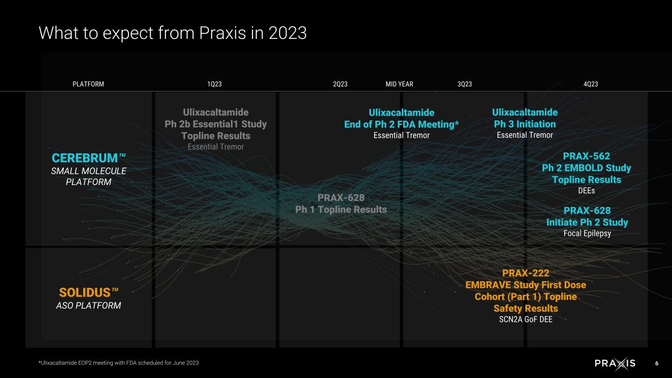 4 PHASE TWO Targeting movement disorders & epilepsies connected by neuronal imbalance *PRAX-020 (KCNT1) is a research collaboration with UCB +PRAX-080 (PCDH19 ), PRAX-090 (SYNGAP1) & PRAX-100 (SCN2A-LoF) ASOs are a collaboration with The Florey Institute of Neuroscience and Mental Health PRECLINICAL PHASE ONE REGISTRATION ENABLINGPLATFORM PRAX-020* KCNT1 PRAX-030 Undisclosed PRAX-050 Undisclosed PRAX-090+ SYNGAP1 PRAX-100+ SCN2A LoF PRAX-080+ PCDH19 CEREBRUM™ SMALL MOLECULE PLATFORM SOLIDUS™ ASO PLATFORM Ulixacaltamide Parkinson’s Disease PRAX-222 SCN2A GoF DEE Ulixacaltamide Essential Tremor PRAX-562 DEEs PRAX-628 Focal Epilepsy